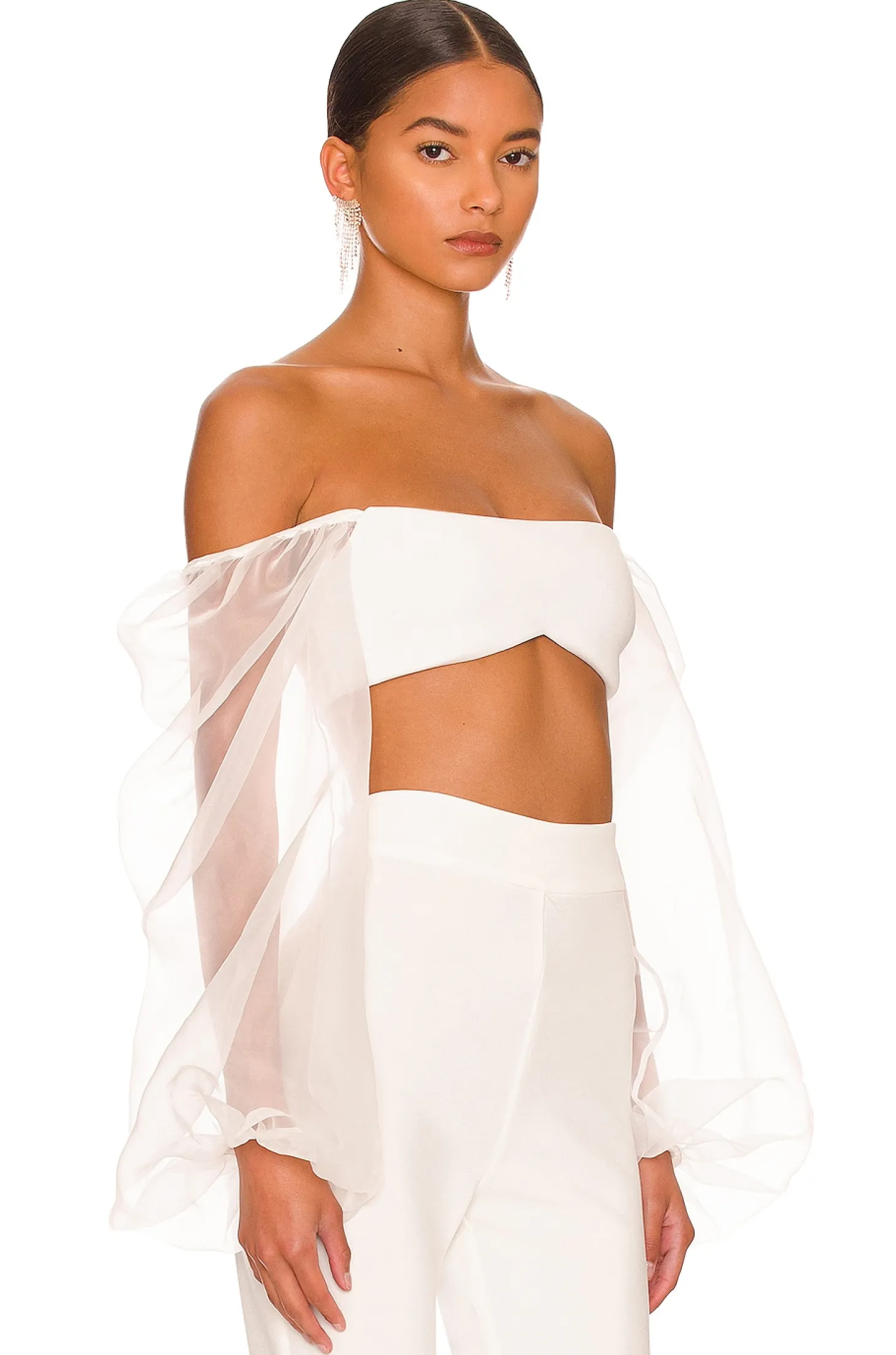 95% poly 5% spandex.Made in Australia.Machine wash.Padded cups.Back hook and eye closure.Sheer organza sleeves with elastic cuffs.Item not sold as a set