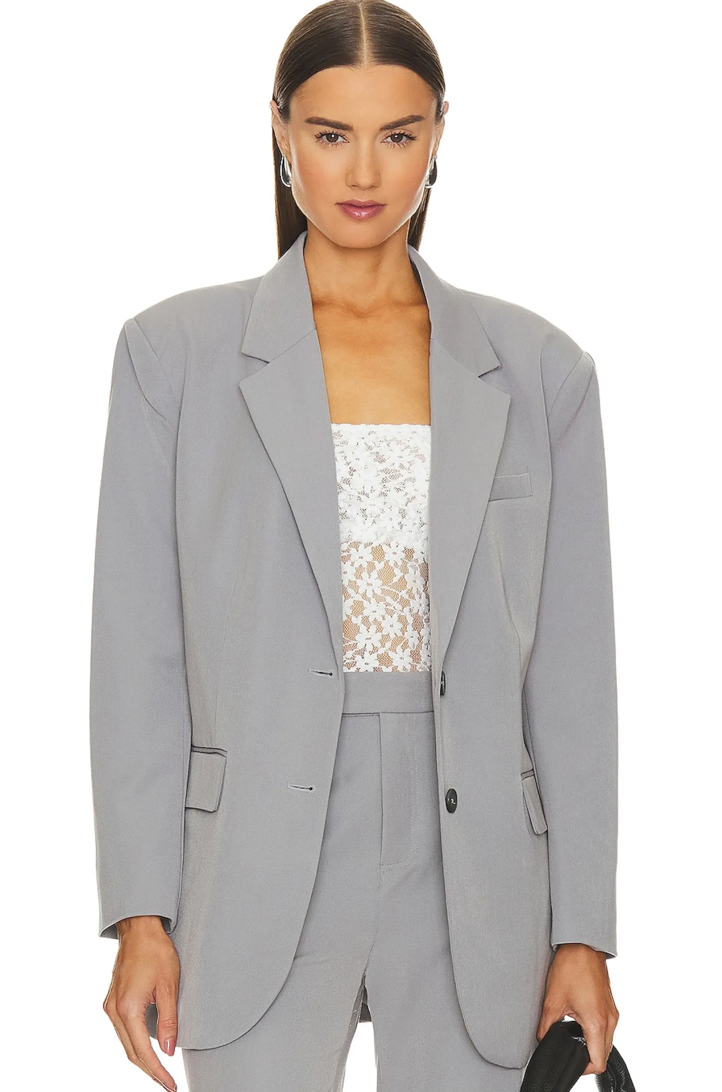 Self: 80% polyester 16% rayon 4% elastane Lining: 100% polyester.Made in China.Hand wash.Front button closure.Padded shoulders.3-pocket styling.Back vent.Item not sold as a set