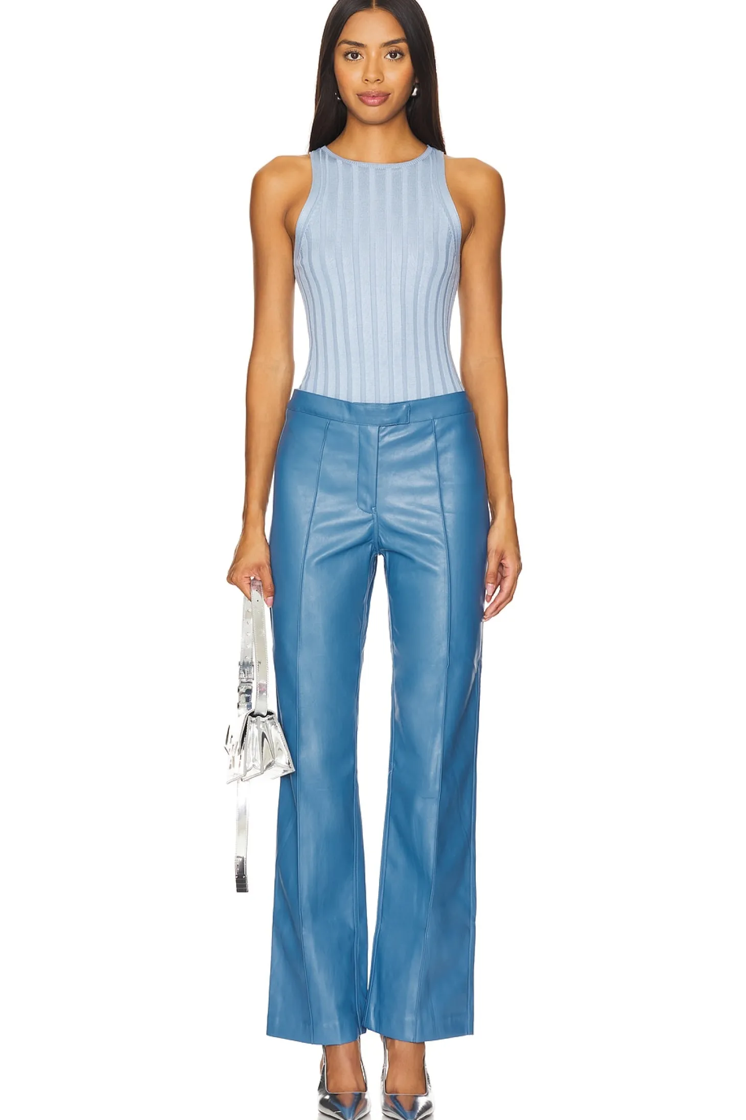 70% polyurethane 30% polyester.Made in China.Hand wash.Zip fly with snap button closure.8.5" at the knee and 9" at the leg opening