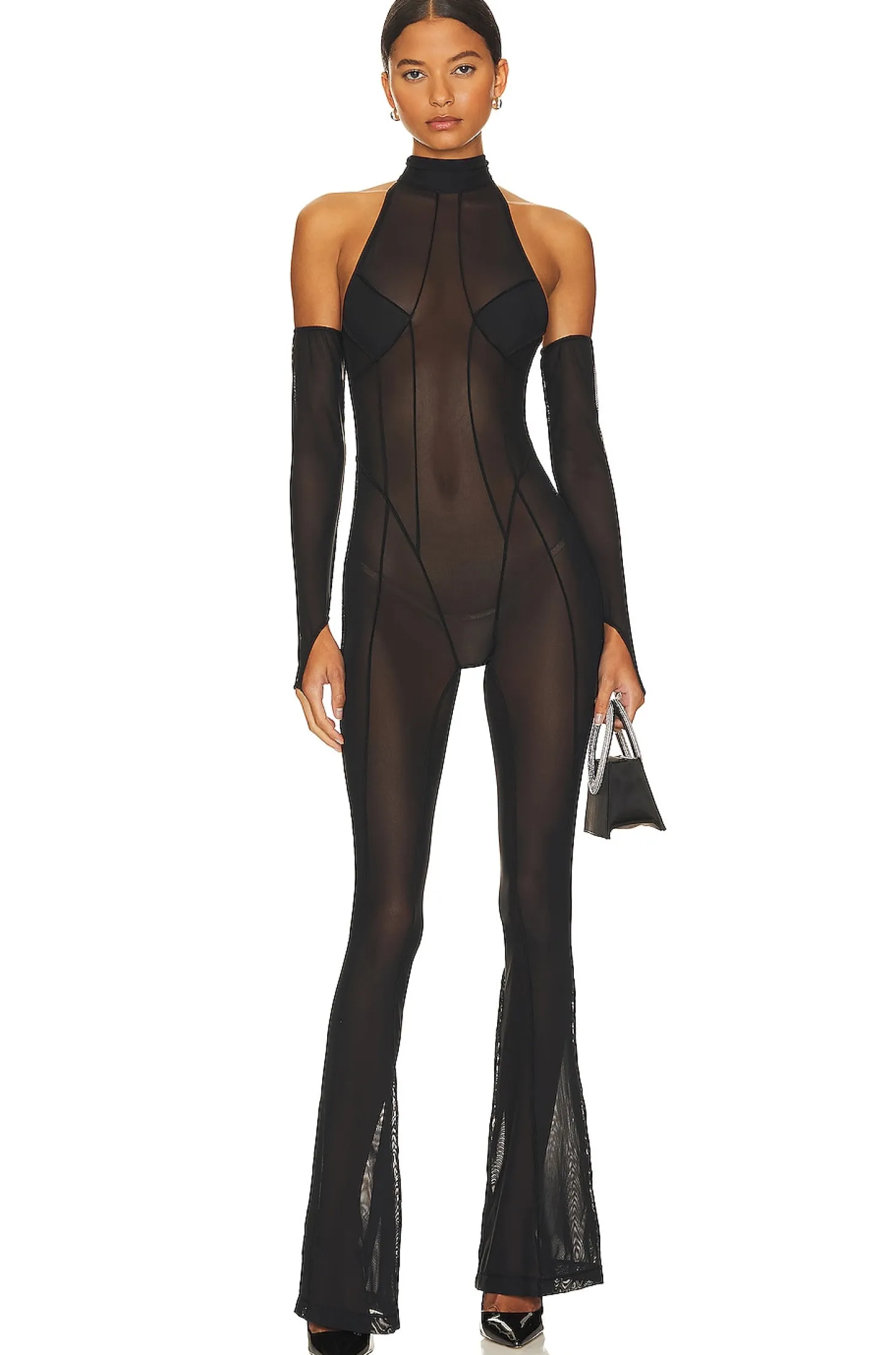 90% polyester 10% spandex.Made in Indonesia.Hand wash.Hidden back zipper closure.Mockneck styling.Concealed bust Detachable sleeves.Sheer mesh fabric