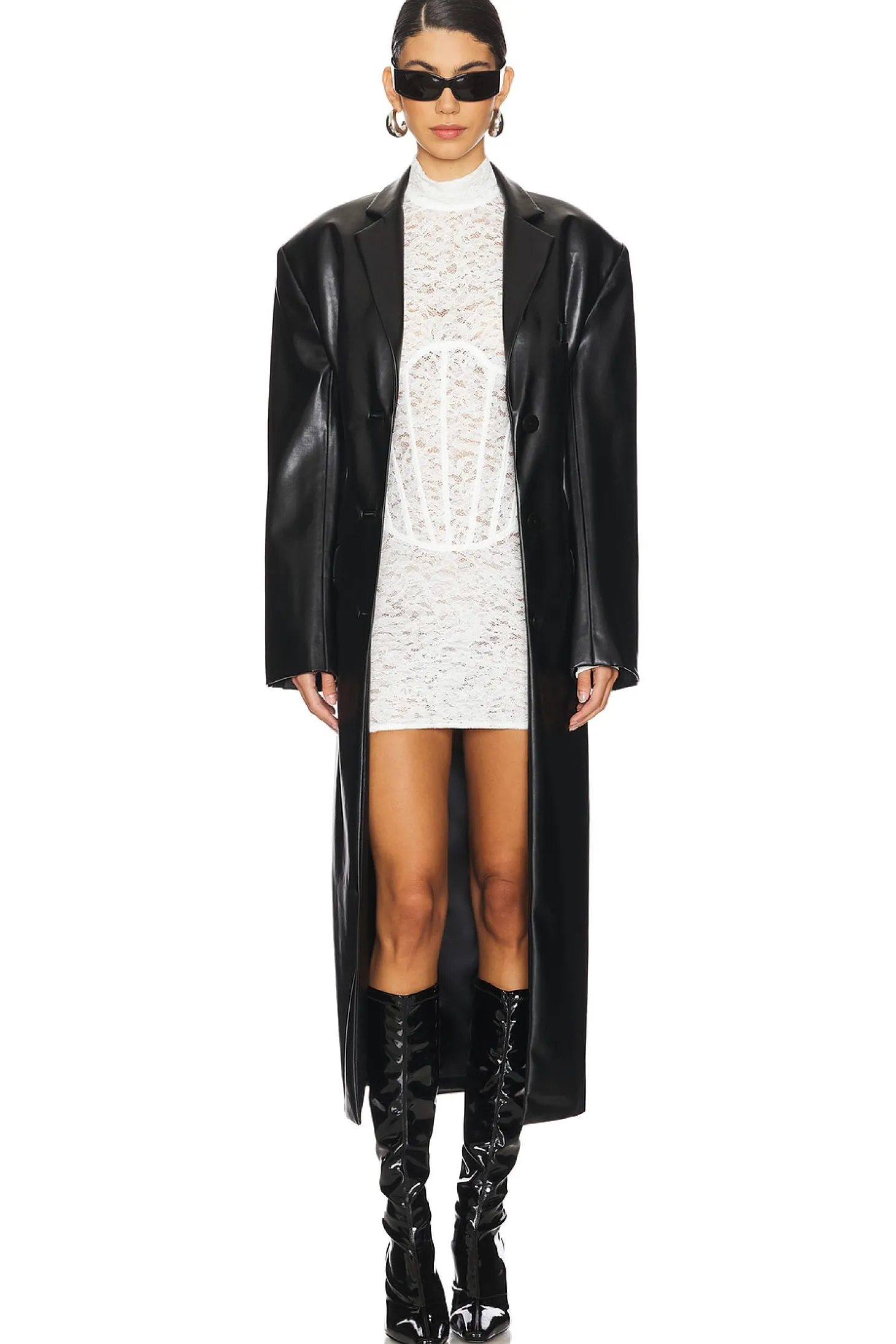 100% polyester.Made in Turkey.Dry clean only.Unlined.Hidden back zipper closure Boned bodice.Zip cuffs Floral lace fabric.Garment is intentionally sheer, undergarments will show through. Please note undergarment not included