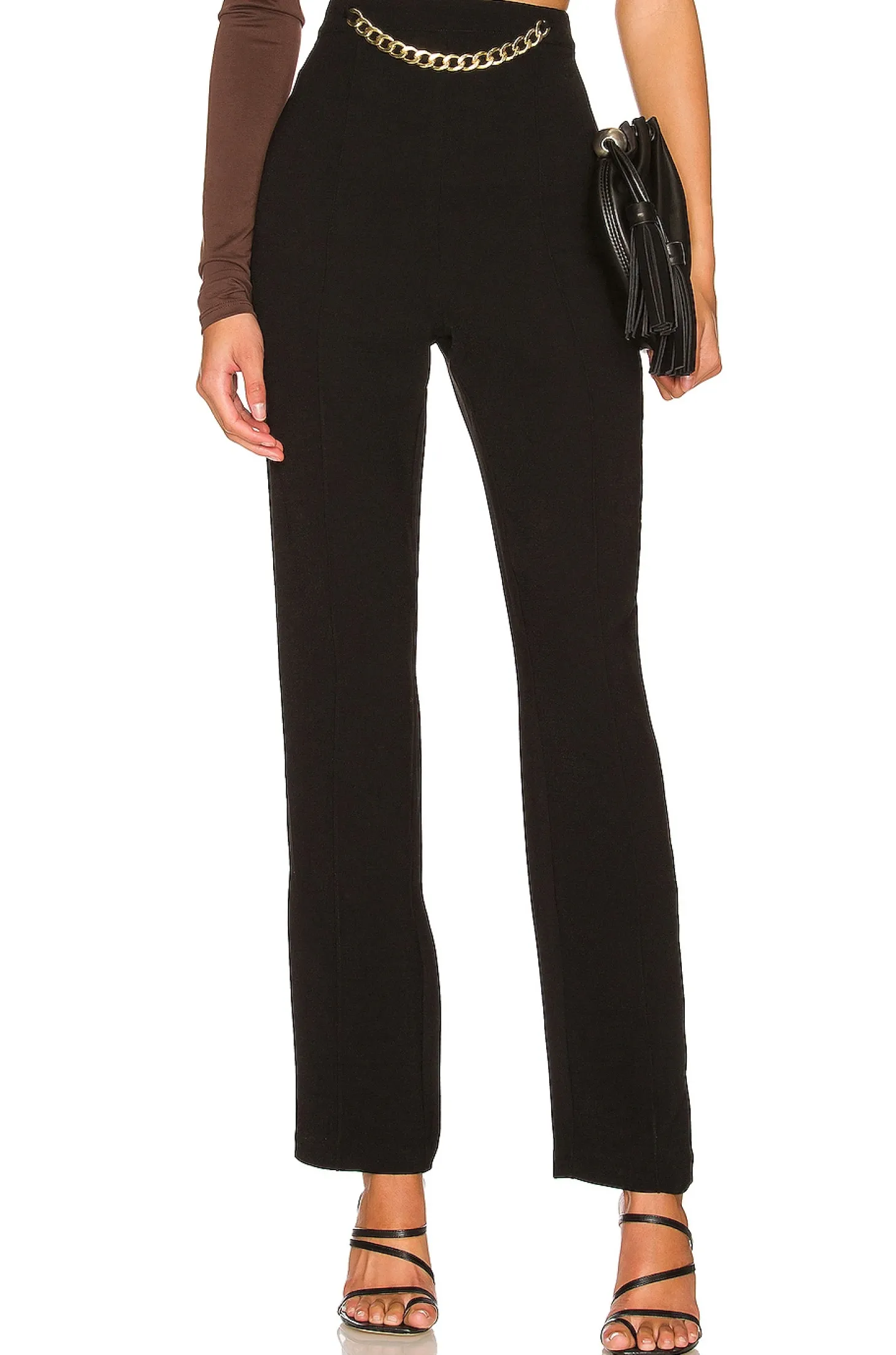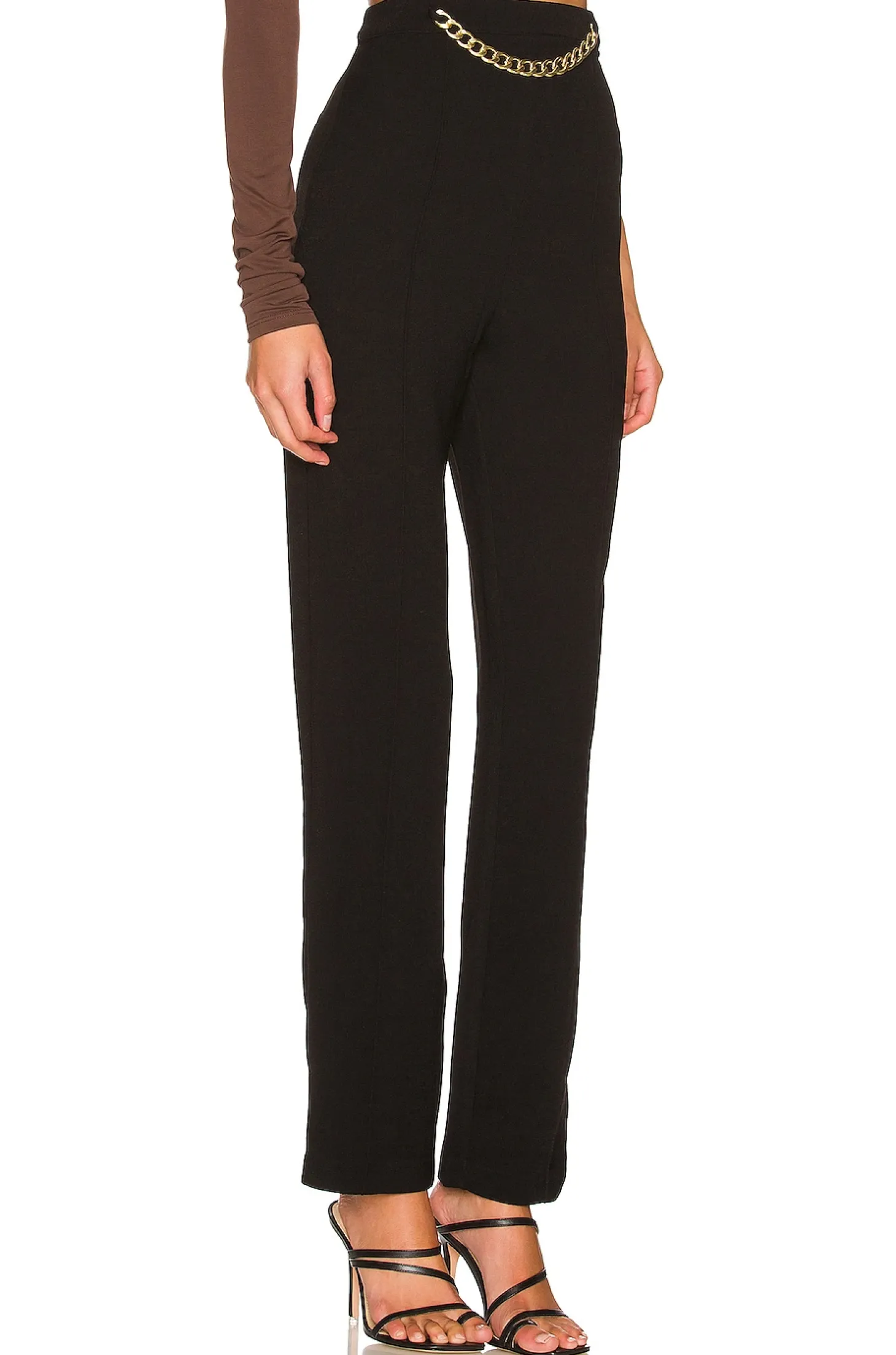 95% poly 5% elastane.Made in China.Hand wash.Hidden side zipper closure.Faux back slip pockets.Attached gold-tone chainlink accent.Crepe fabric with pintuck detail at front.16" at the knee narrows to 12.5" at the leg opening