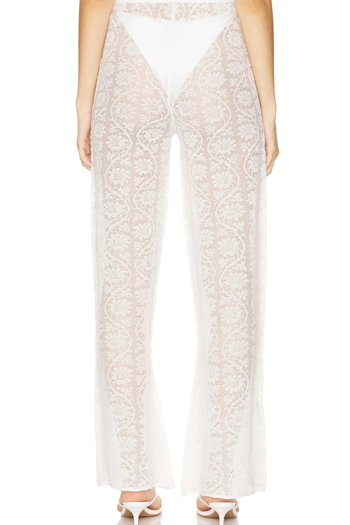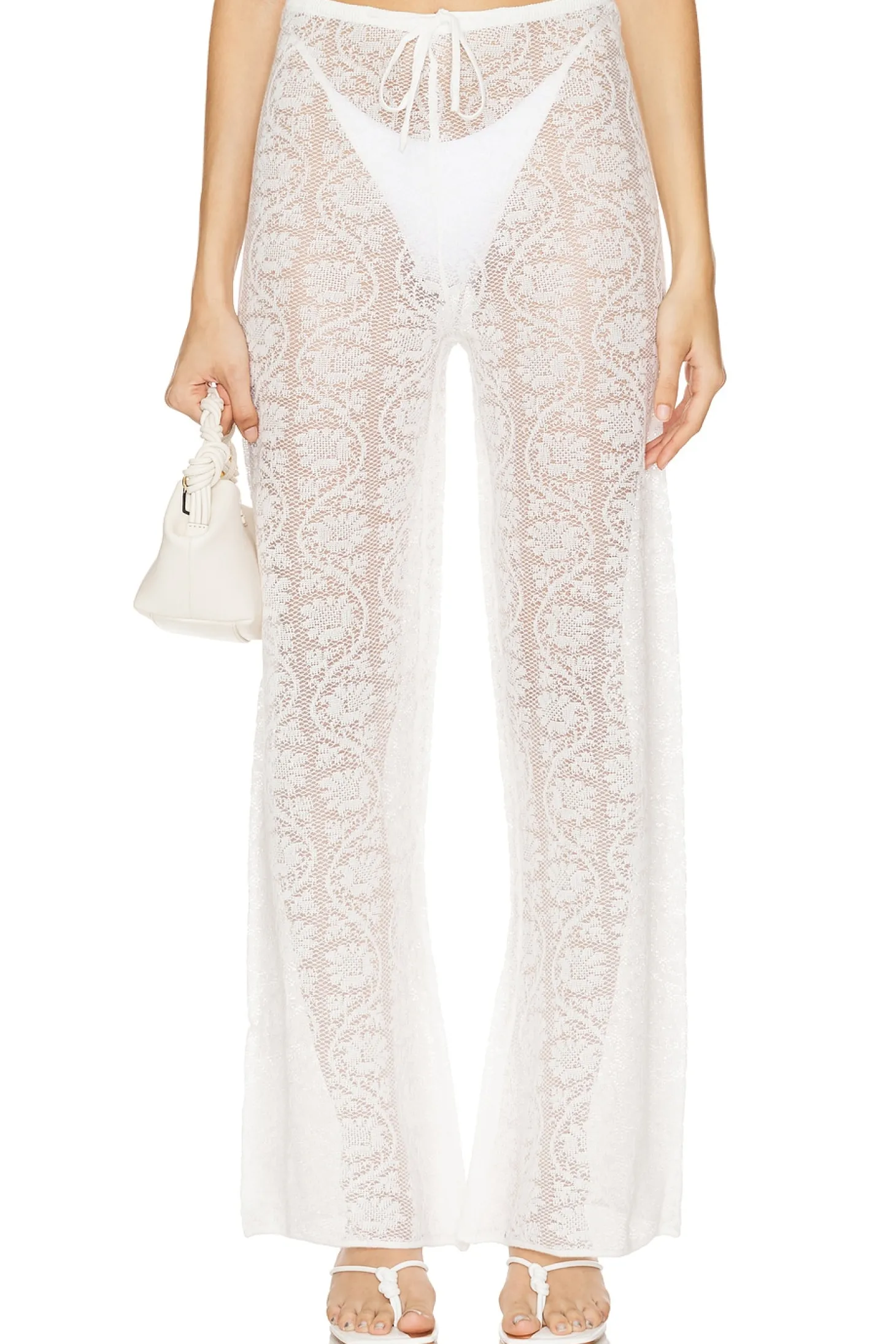 Self 1: 100% cotton Self 2: 100% polyester.Made in China.Hand wash.Pull-on styling with drawstring at waist.Garment is intentionally sheer, undergarments will show through. Please note undergarment not included.20" at the knee breaks to 24" at the leg opening