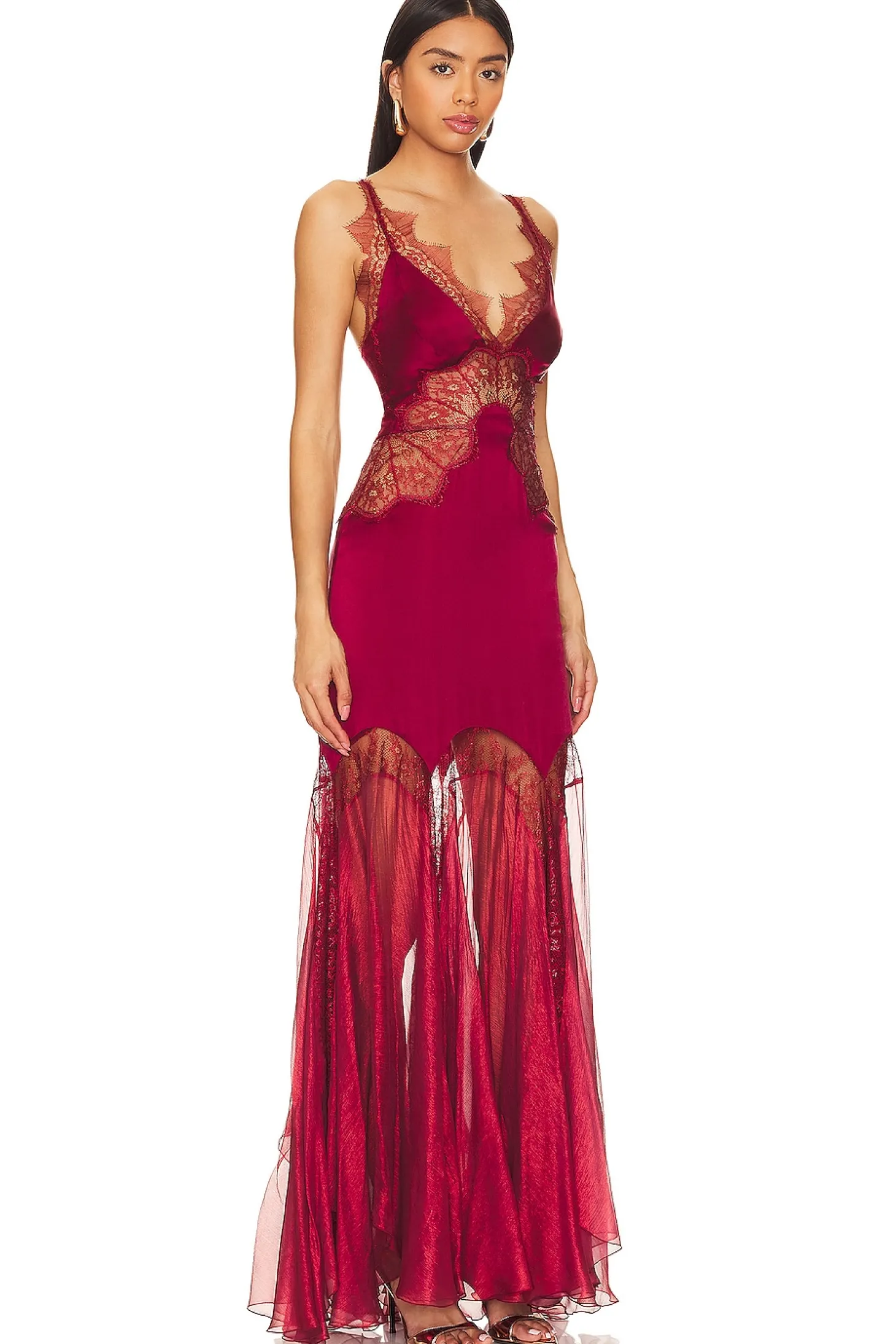 100% silk.Made in Romania.Dry clean only.Unlined.Back tie and exposed back zipper closure.Sheer lace paneling.Metallic plisse skirt with kerchief hem