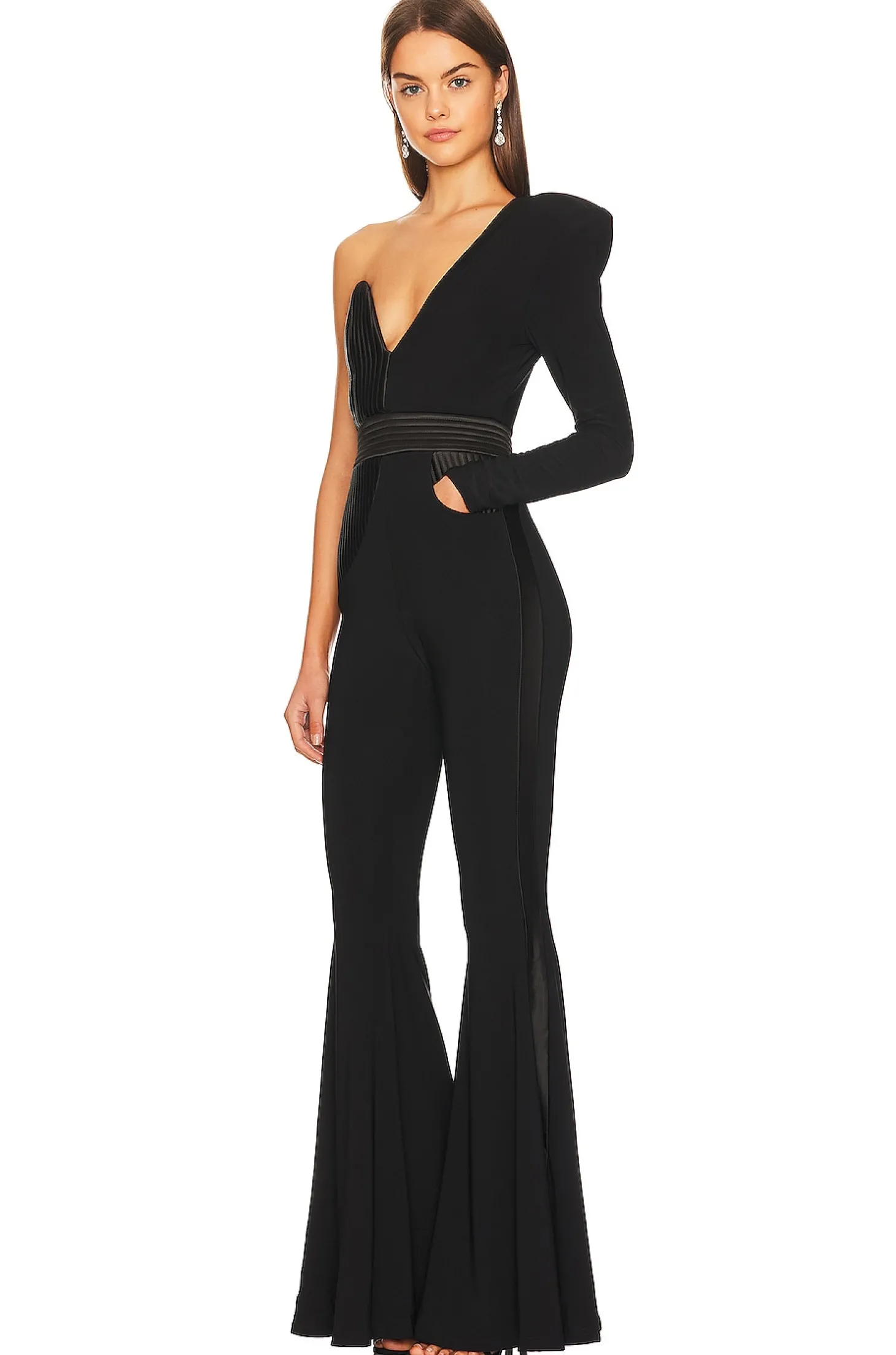 95% polyester 5% elastane.Made in China.Hand wash.Exposed side zipper closure.One shoulder styling with padded shoulder.Ribbed satin details