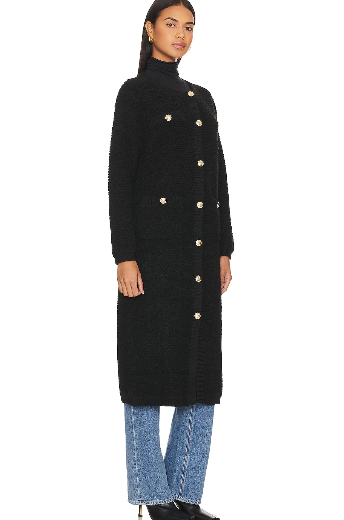 57% acrylic 28% polyester15% nylon.Made in China.Dry clean only.Front gold-tone button closure.Front slip pockets with gold-tone button closure.Faux breast slip pocket.Ribbed cuffs.Midweight knit fabric