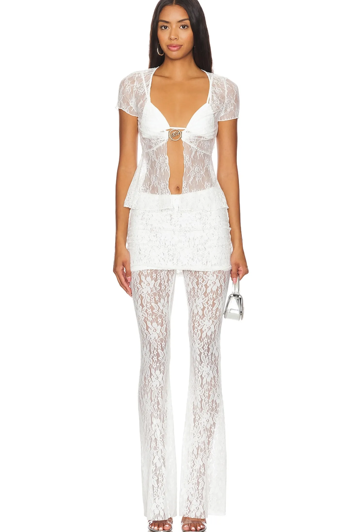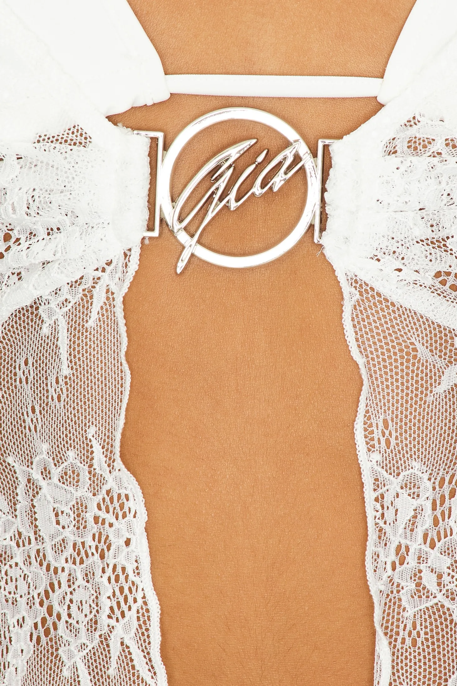 90% nylon 10% elastane.Made in Cambodia.Hand wash.Unpadded bralette with adjustable shoulder straps.Silver-tone Gia hardware at front.Stretch lace fabric.Garment is intentionally sheer, undergarments will show through. Please note undergarment is included