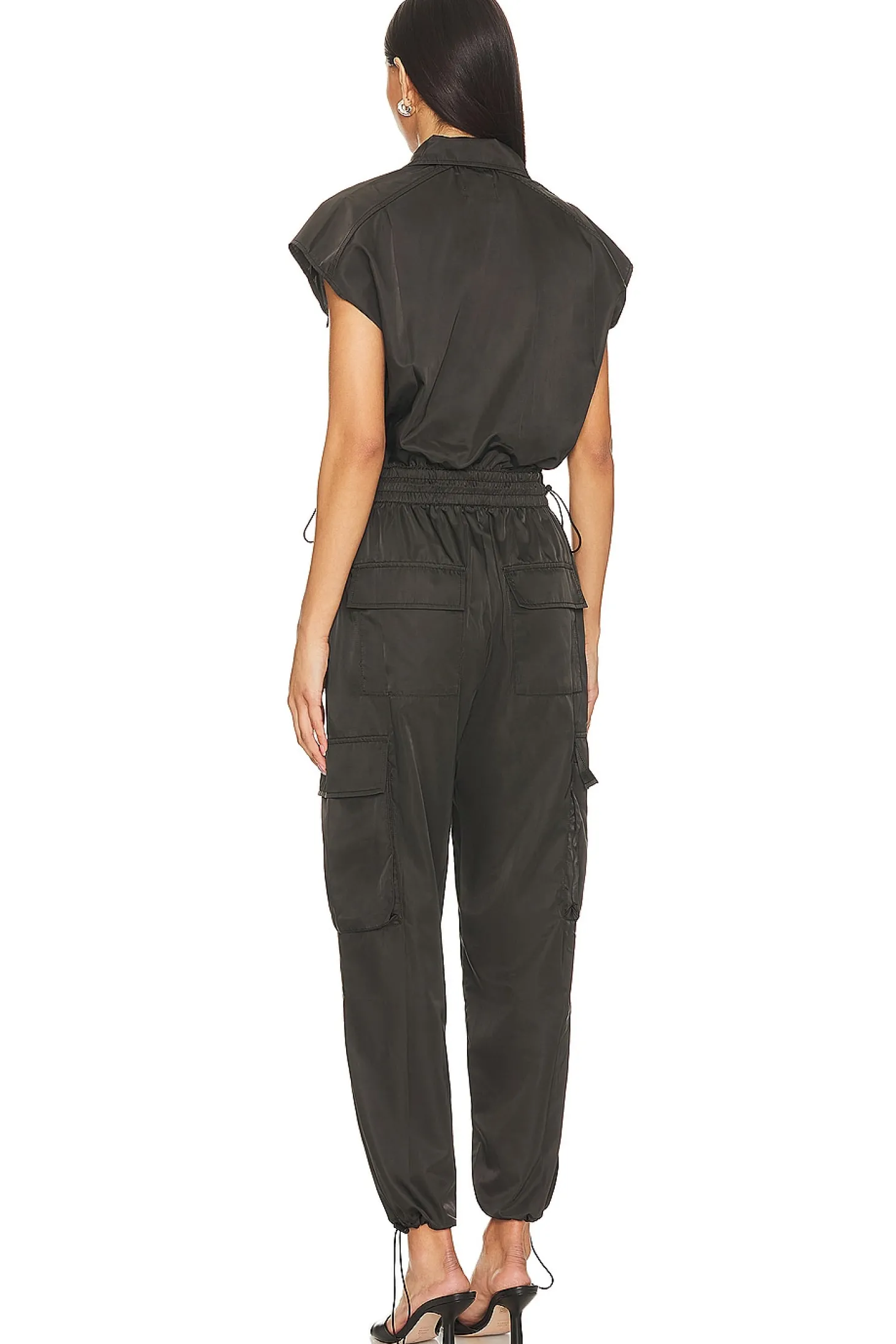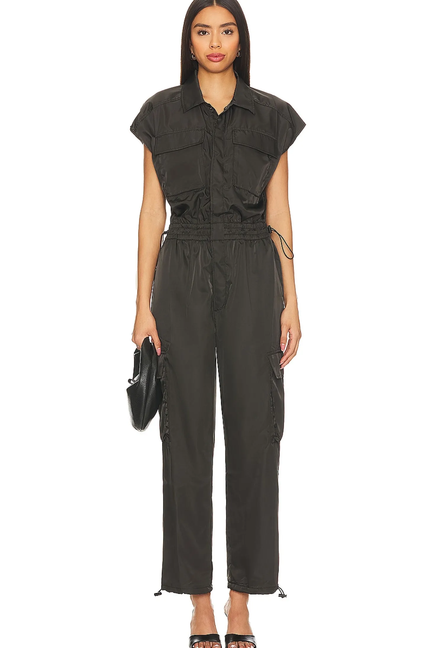 100% polyester.Made in China.Machine wash.Front button closure.Elastic drawcord waistband.8-pocket styling includes four cargo flap pockets.Satin fabric
