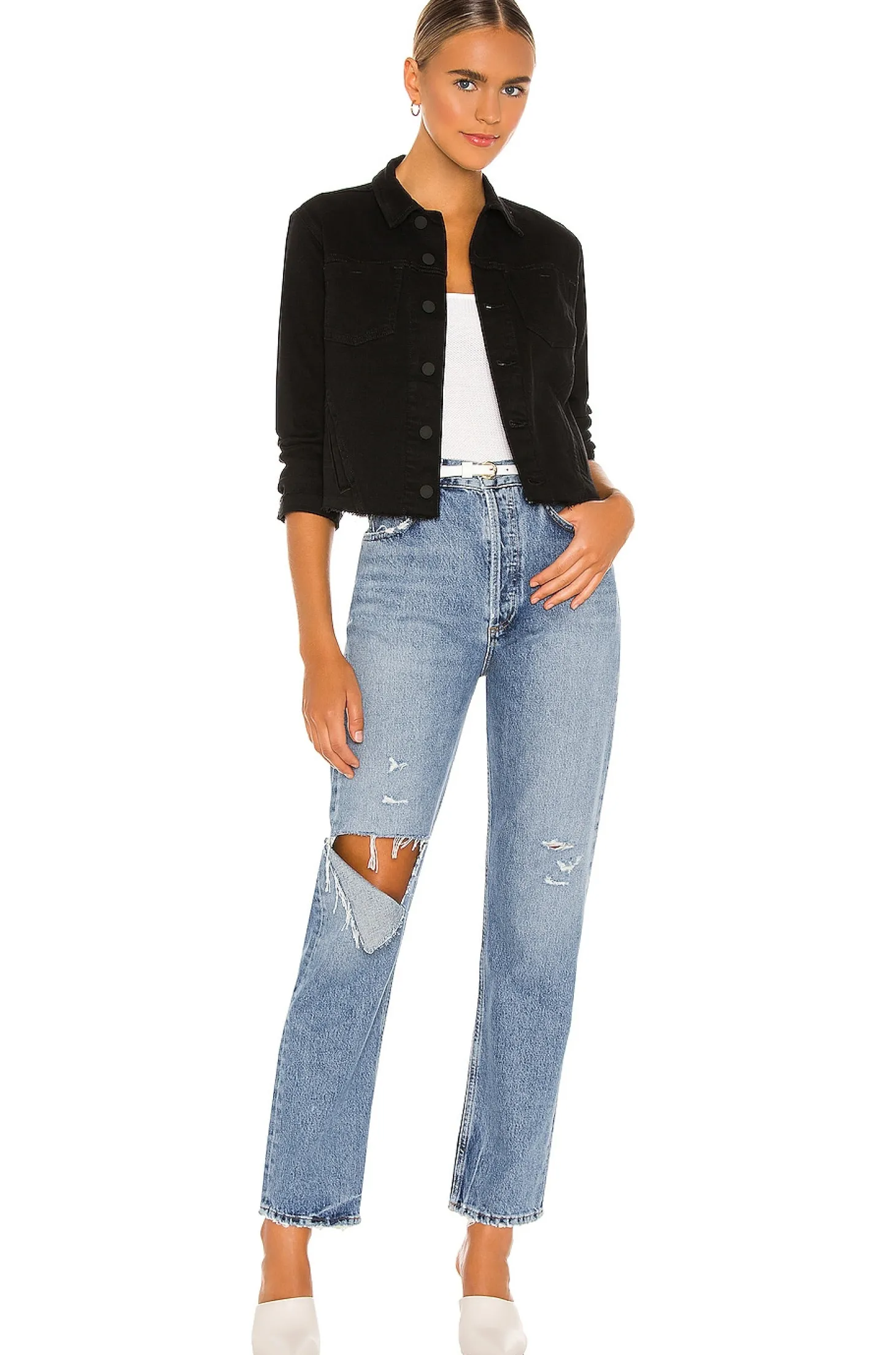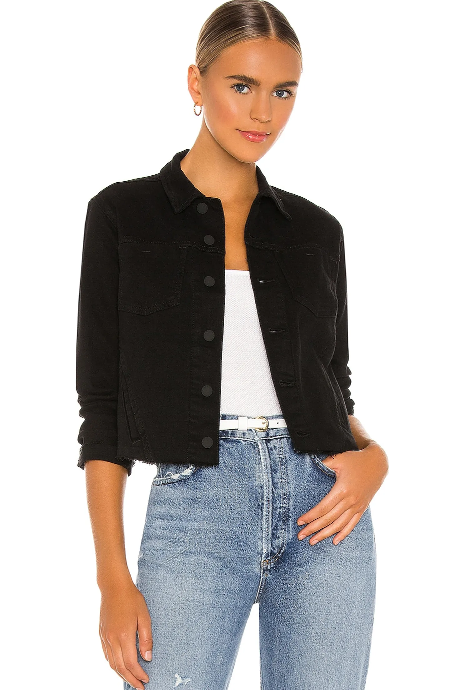 Self: 88% cotton 11% polyester 1% spandex Lining: 65% polyester 33% cotton.Made in U.S.A.Machine wash cold.Breast pockets.Front button closure.Side seam pockets.Raw cut trim