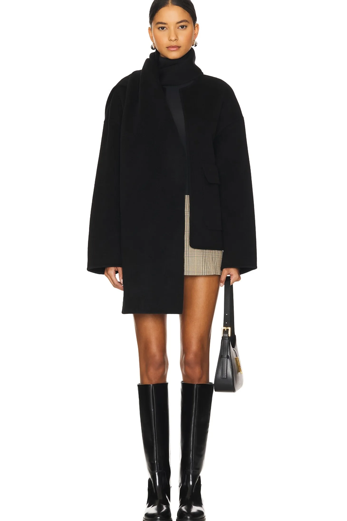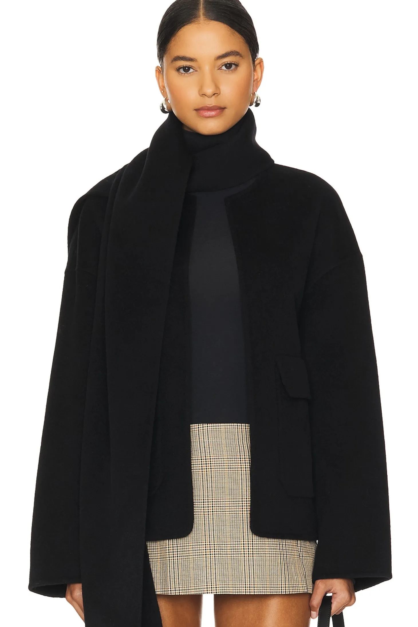 75% wool 15% viscose 10% cashmere.Made in China.Dry clean.Open front.Dual front flap slip pockets.Melton fabric with scarf included and snap button at neckline to secure it.Jacket and scarf sold as a set