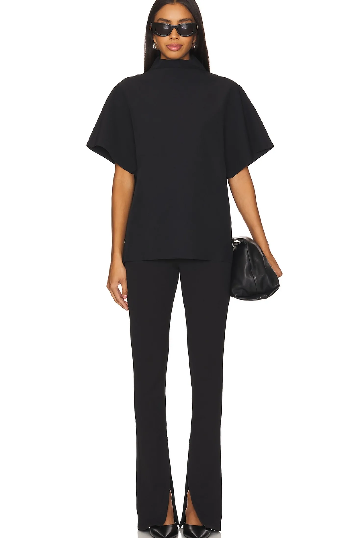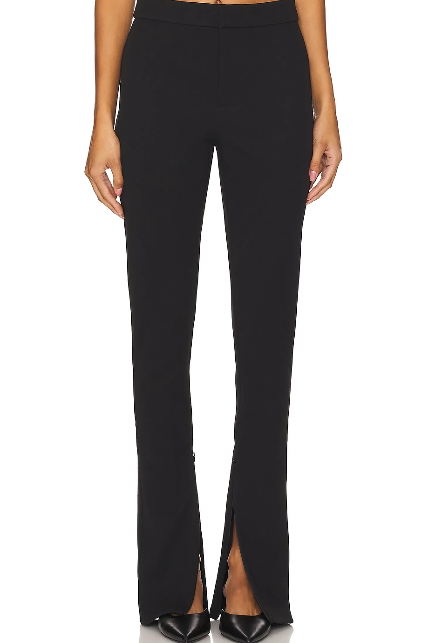 Self 1: 95% polyester 5% spandex Self 2: 100% polyester.Made in China.Dry clean only.Zip fly with hook and bar closure.Back welt pockets.Slit detail at inner ankle with zipper closure.Crepe fabric.13" at the knee and 13" at the leg opening