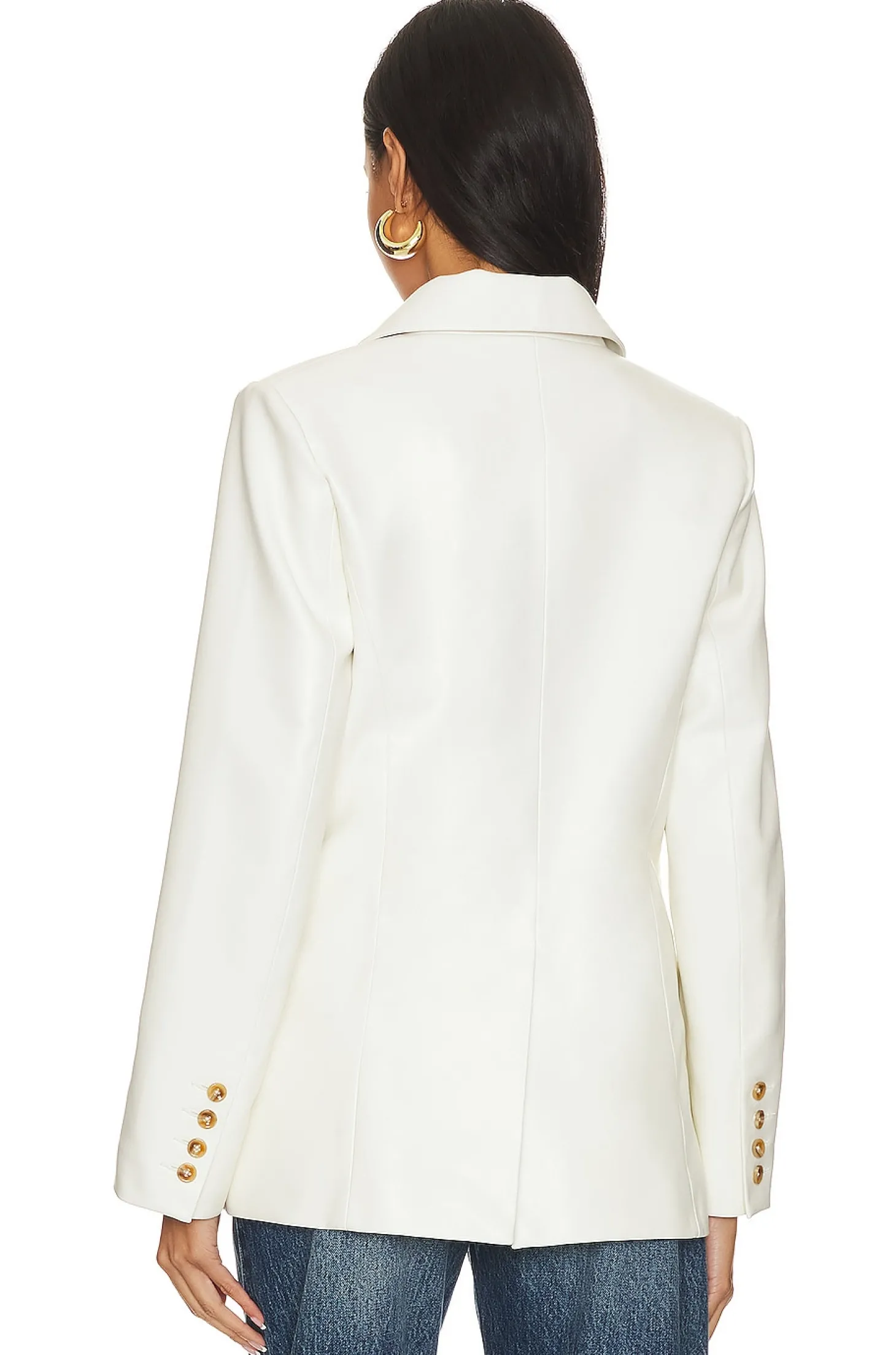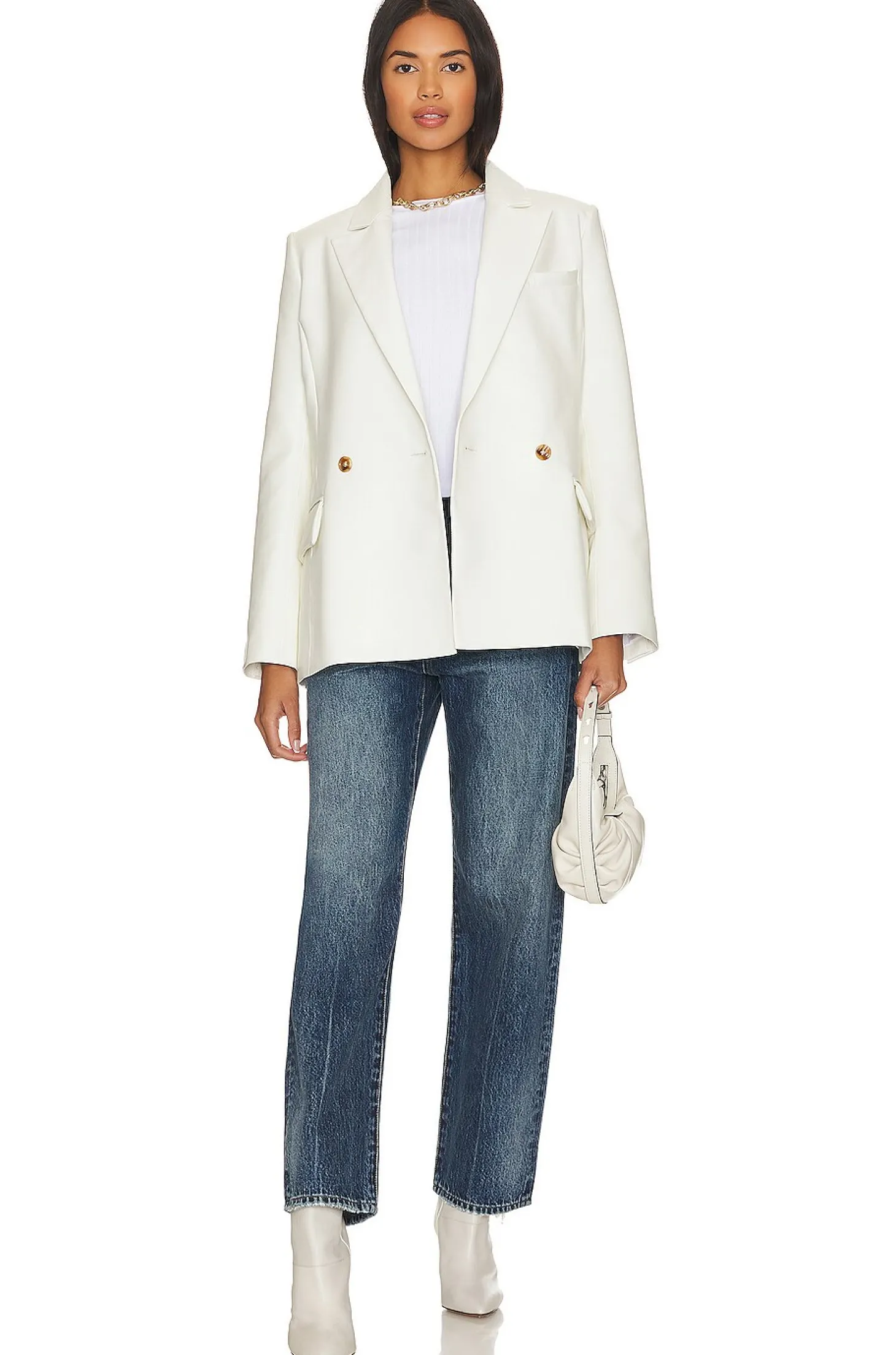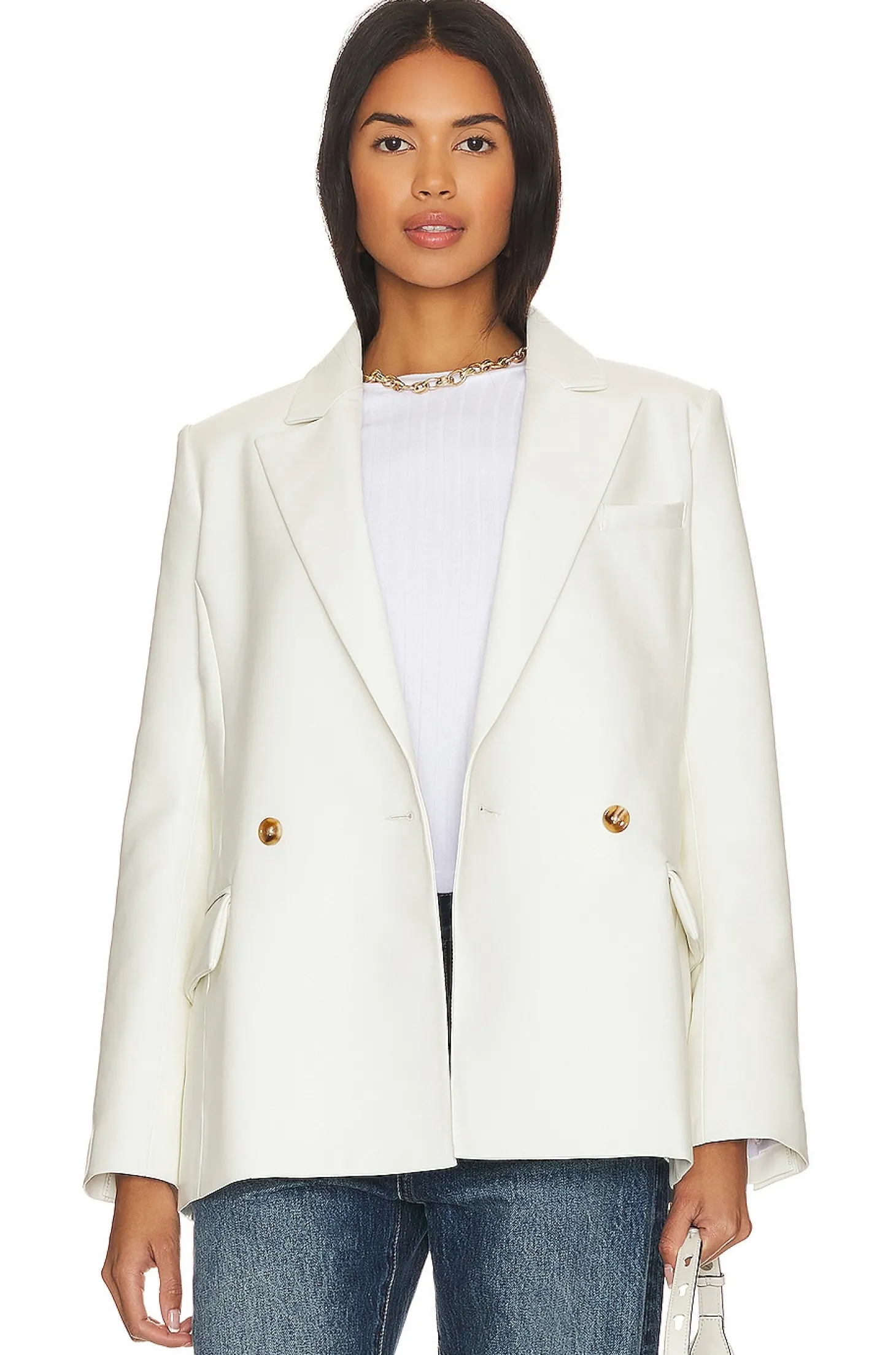 Self: 100% polyurethane Lining: 100% polyester.Made in China.Hand wash.Double breasted front button closure.Padded shoulders.Buttoned cuffs.Faux leather fabric with back vent