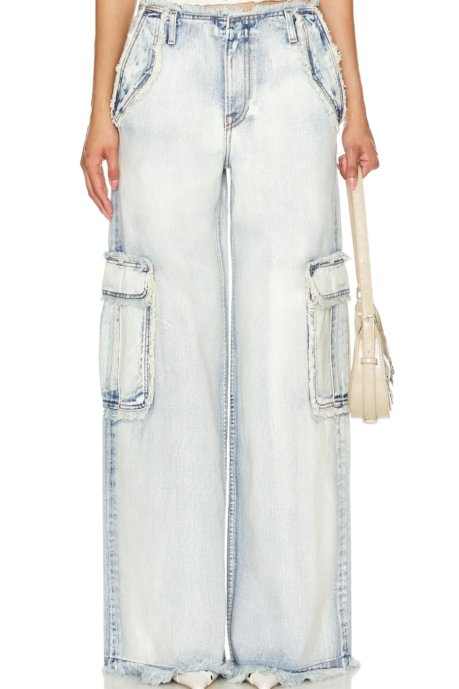 100% cotton.Made in USA.Hand wash.Zip fly with button closure.6-pocket styling includes two cargo button pockets.Rigid denim fabric with frayed trim.Item not sold as set.26" at the knee breaks to 26" at the leg opening