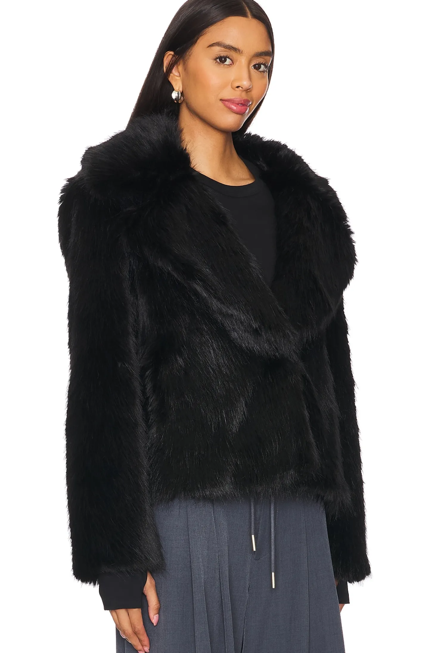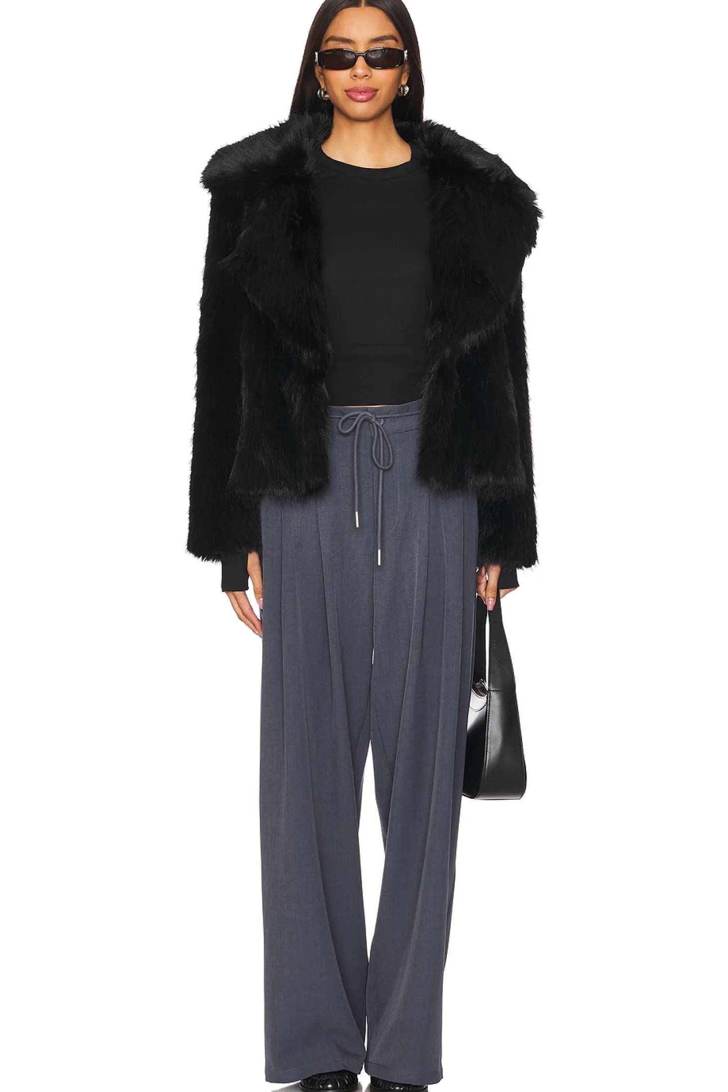 Self & Lining: 100% polyester.Made in China.Dry clean only.Front hook and eye closure.Side seam pockets sand notched lapel collar.Heavyweight faux fur fabric with thumbhole design