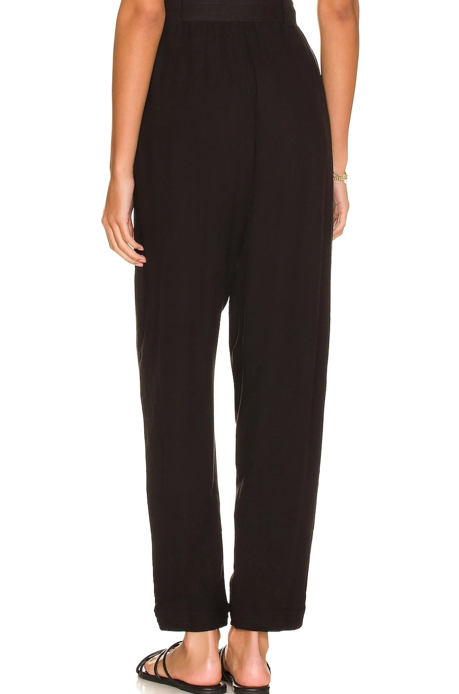 70% rayon 30% linen.Made in Indonesia.Hand wash.Front tie closure.Side seam pockets.Lightweight gauze fabric.Item not sold as set.20" at the knee narrows to 11" at the leg opening