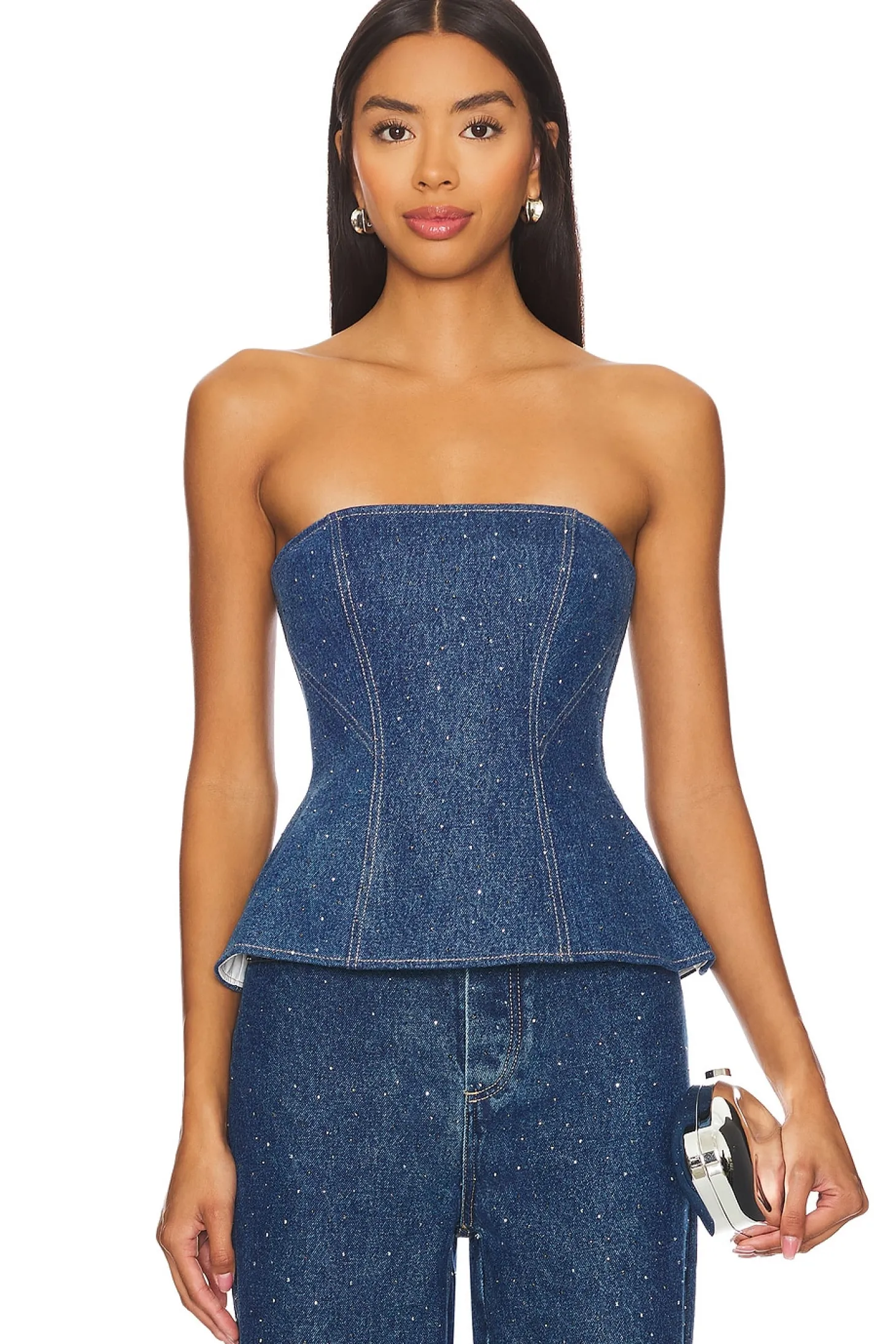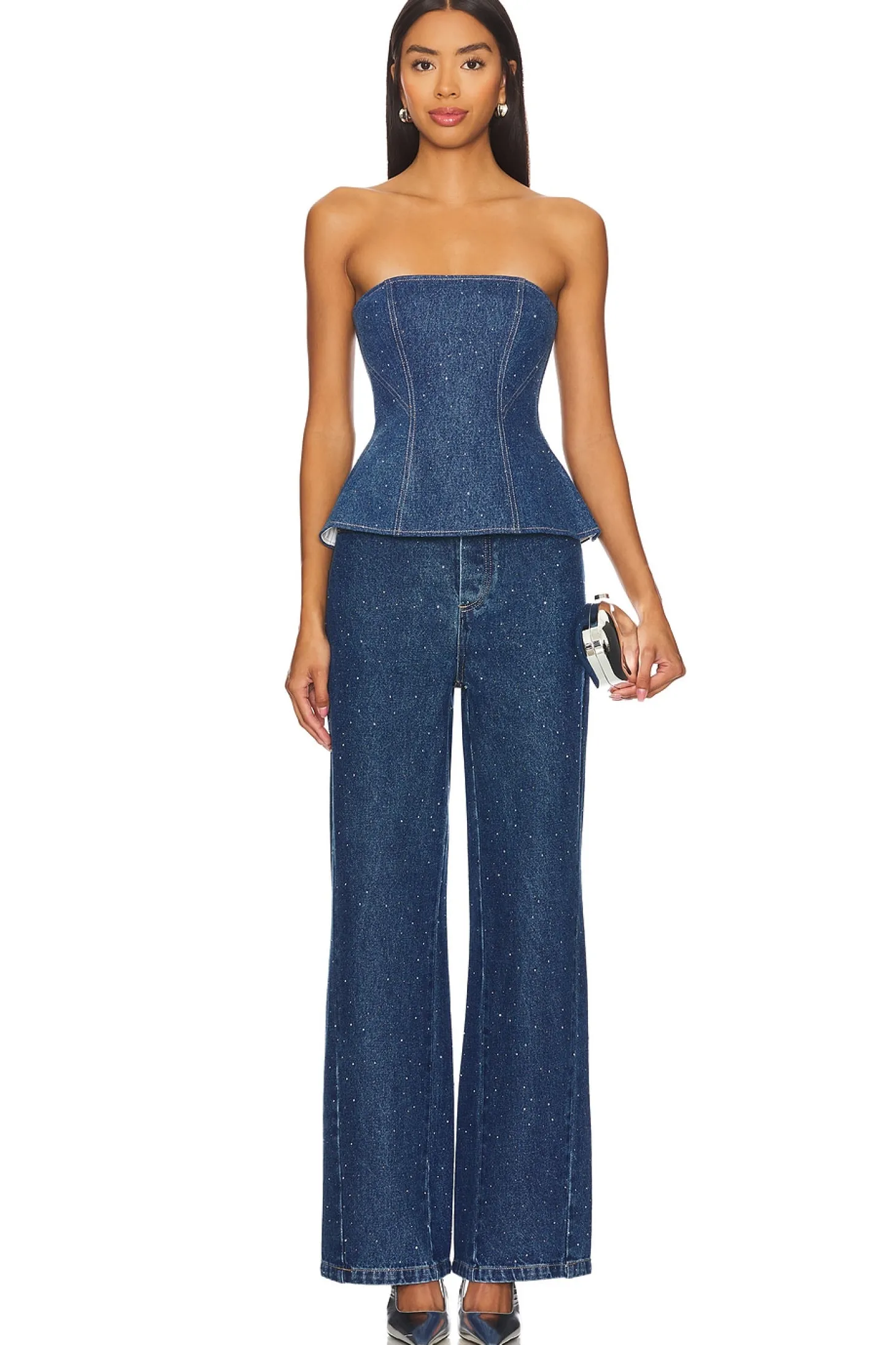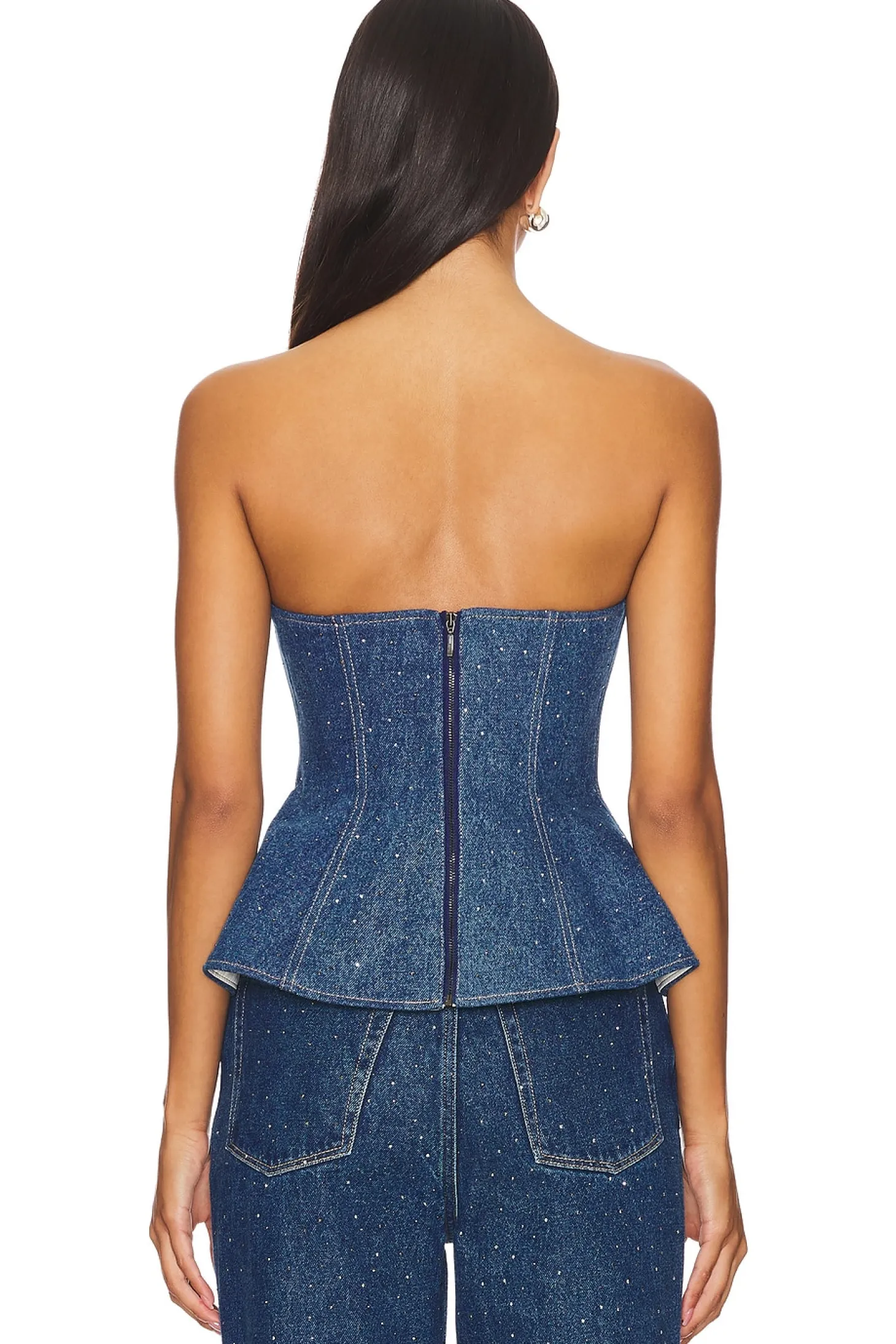 100% cotton.Made in China.Machine wash.Exposed back zipper closure.Midweight denim fabric with crystal embellishments throughout.Item not sold as a set