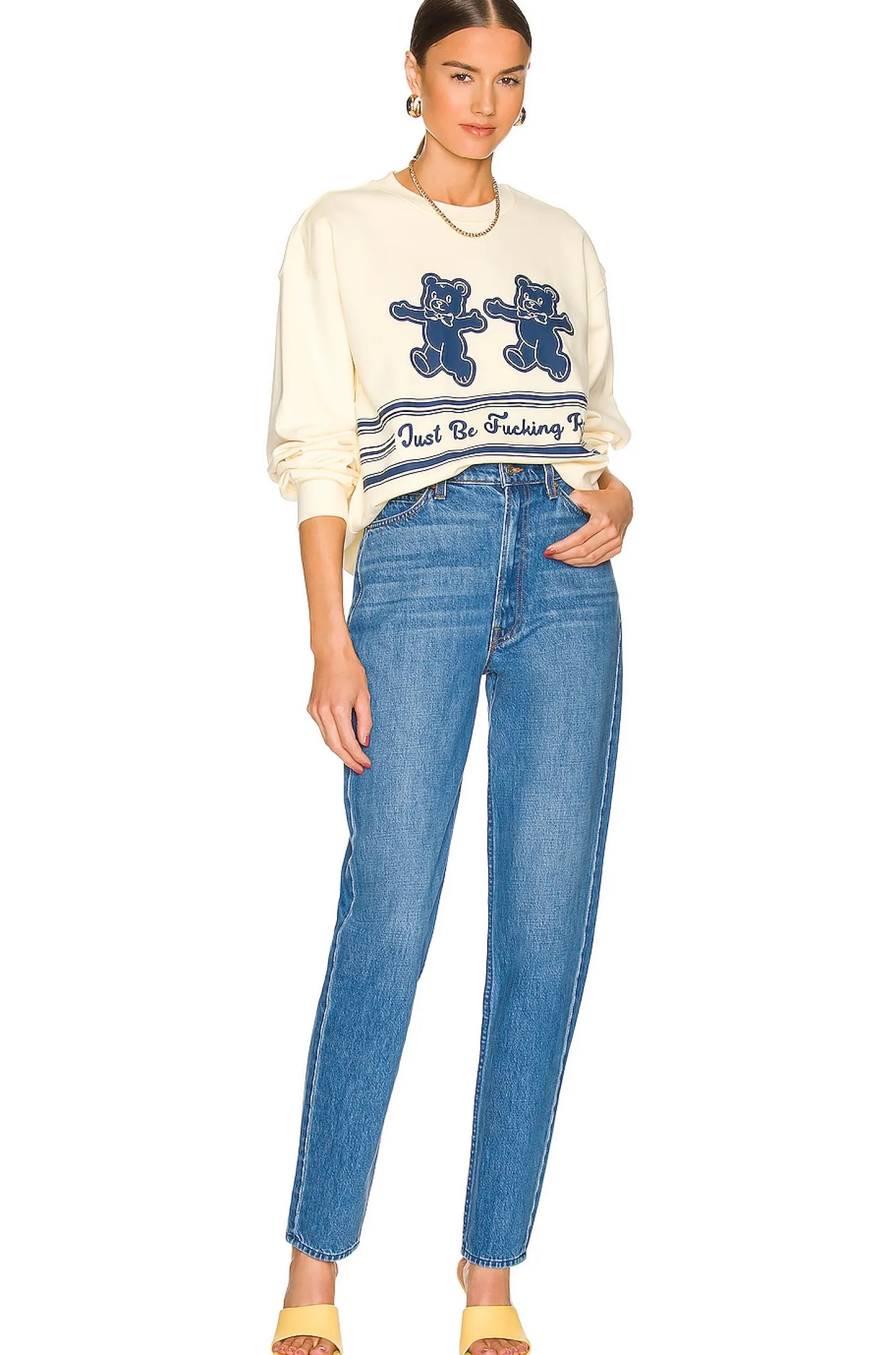 "Just Be Fucking Kind".100% cotton.Made in China.Machine wash.Front graphic.French terry fabric with banded edges.Relaxed fit