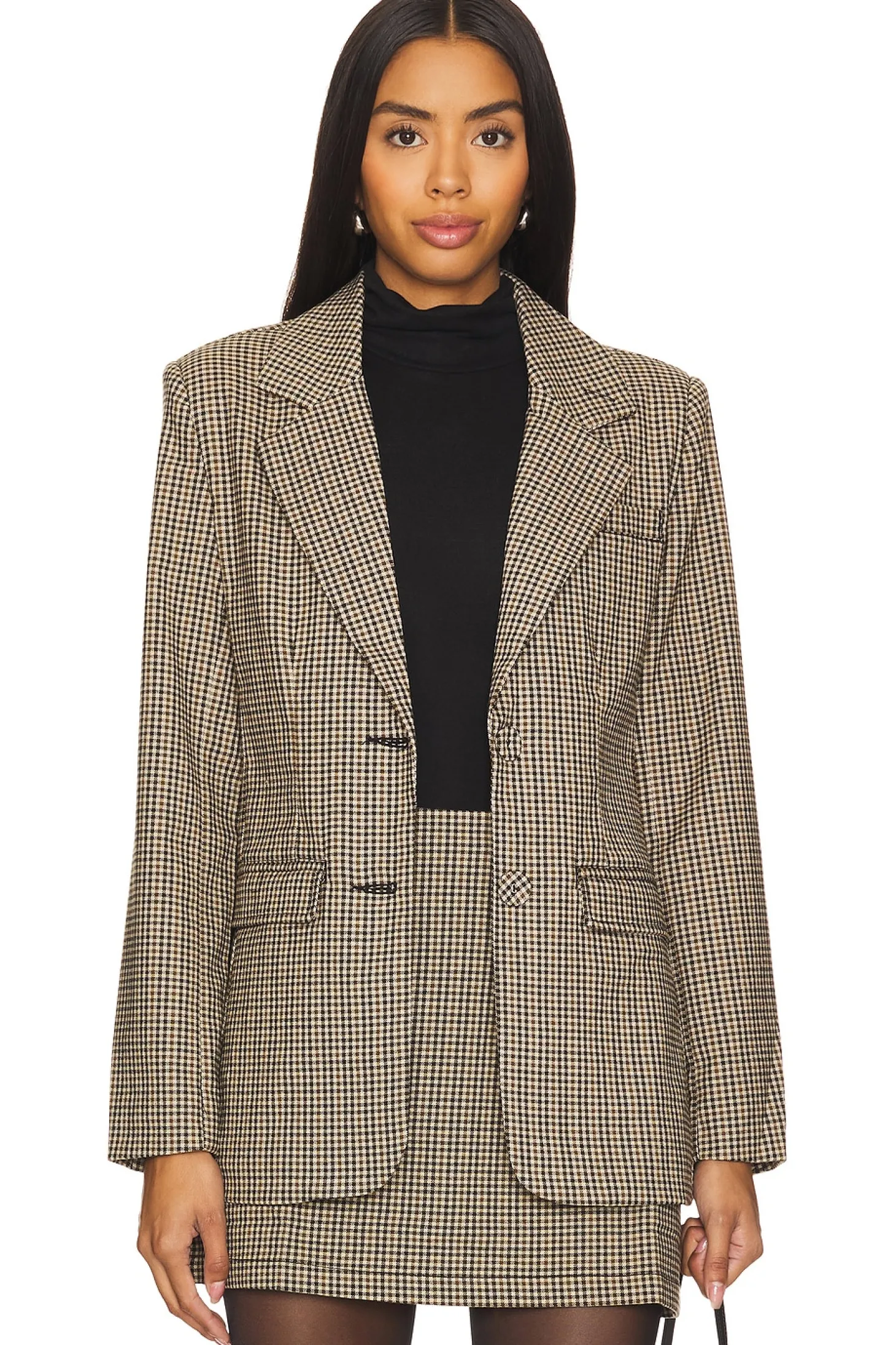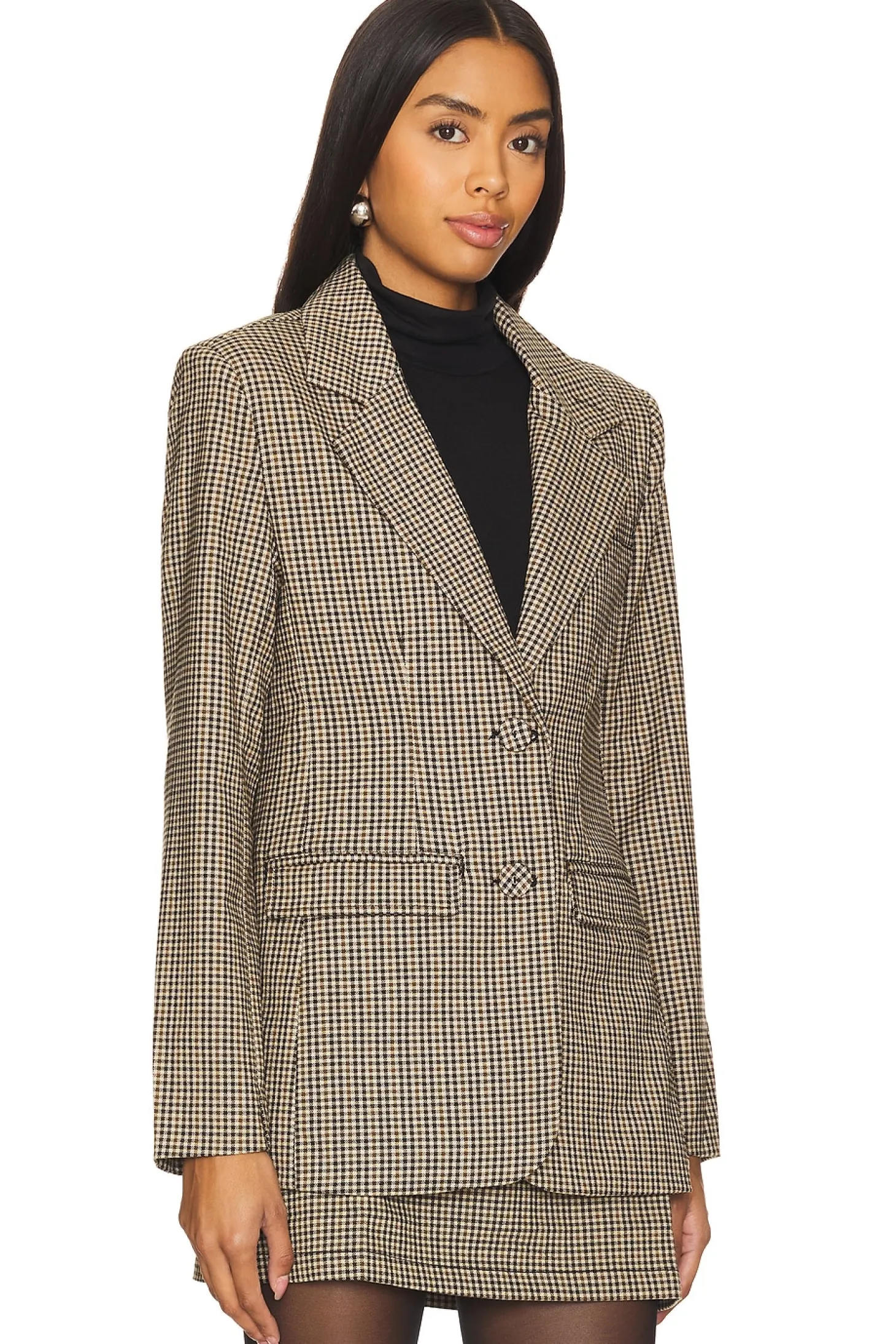 62% polyester 35% viscose 3% elastane.Made in China.Machine wash.Front button closure.Padded shoulders.Button cuffs.3-pocket styling.Twill fabric
