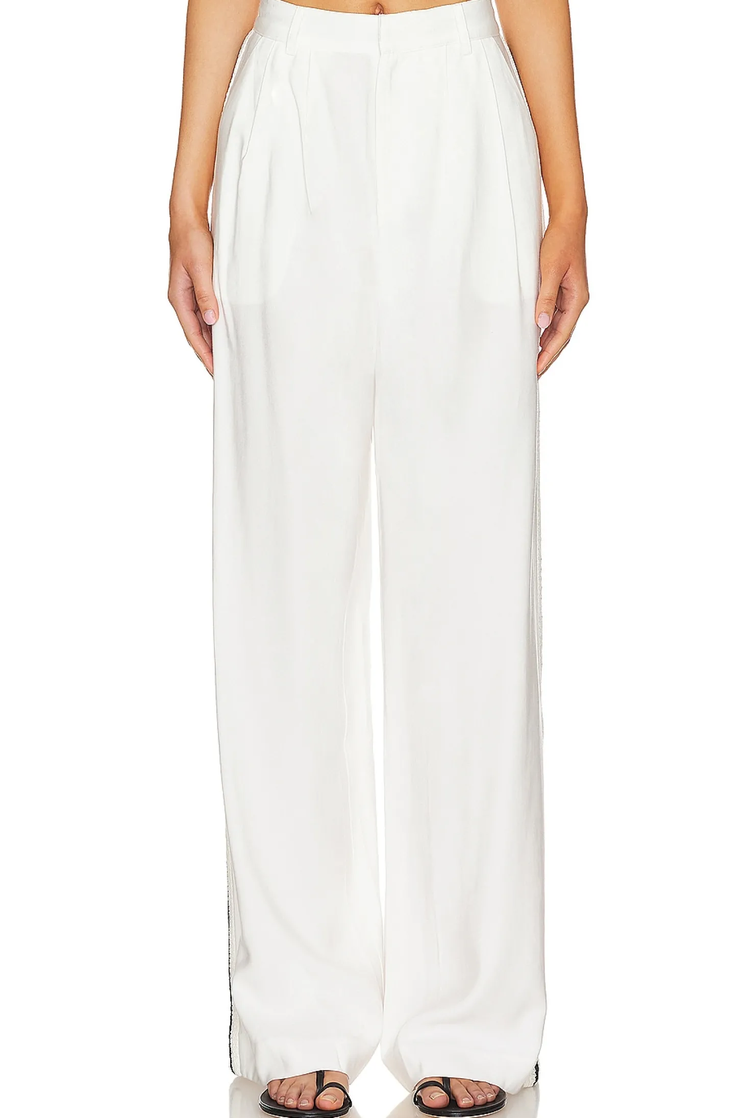 92% rayon 8% polyester.Made in China.Dry clean only.Zip fly with hook and bar closure.4-pocket design.Front pintuck detail.Knit fabric detail at side.22" at the knee and 22" at the leg opening
