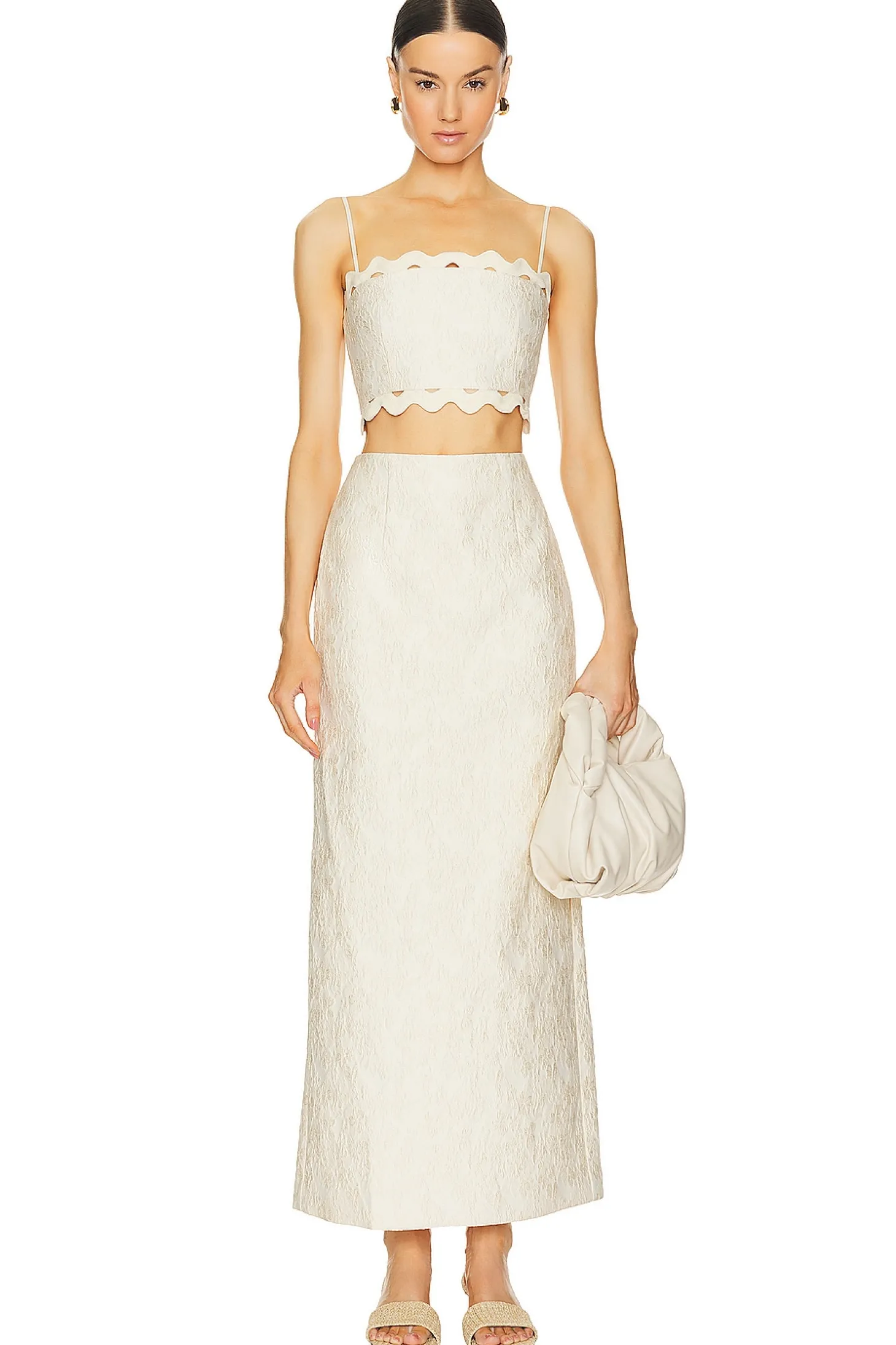 Self: 70% polyester 30% cotton Contrast Fabric: 55% linen 45% rayon Lining: 52% polyester 48% viscose.Made in China.Dry clean.Exposed back zipper closure.Scallop trim.Lightweight jacquard fabric.Item not sold as a set