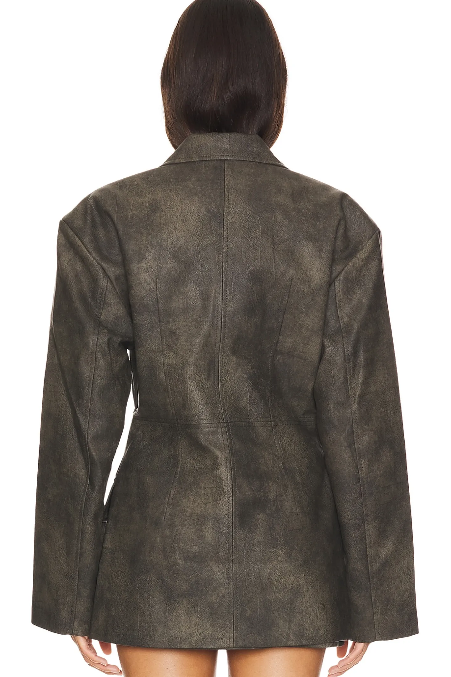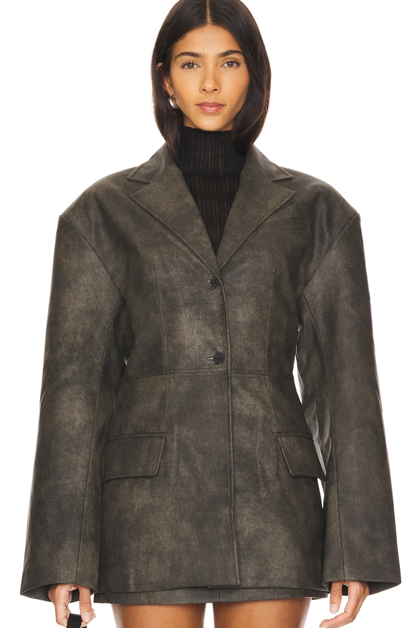 Self: 100% polyester.Made in USA.Dry clean only.Front button closure.3-pocket design.Padded shoulders.Midweight faux leather fabric.Item not sold as a set