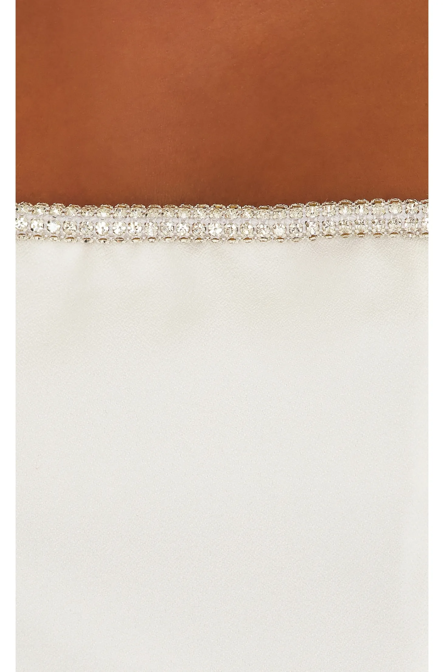 97% polyester 3% spandex.Made in China.Hand wash.Hidden back zipper closure.Non-slip silicone grip trim at neckline Rhinestone embellished neckline trim.Crepe fabric.Neckline to hem measures approx 50" in length 18" at the knee and 20" at the leg opening