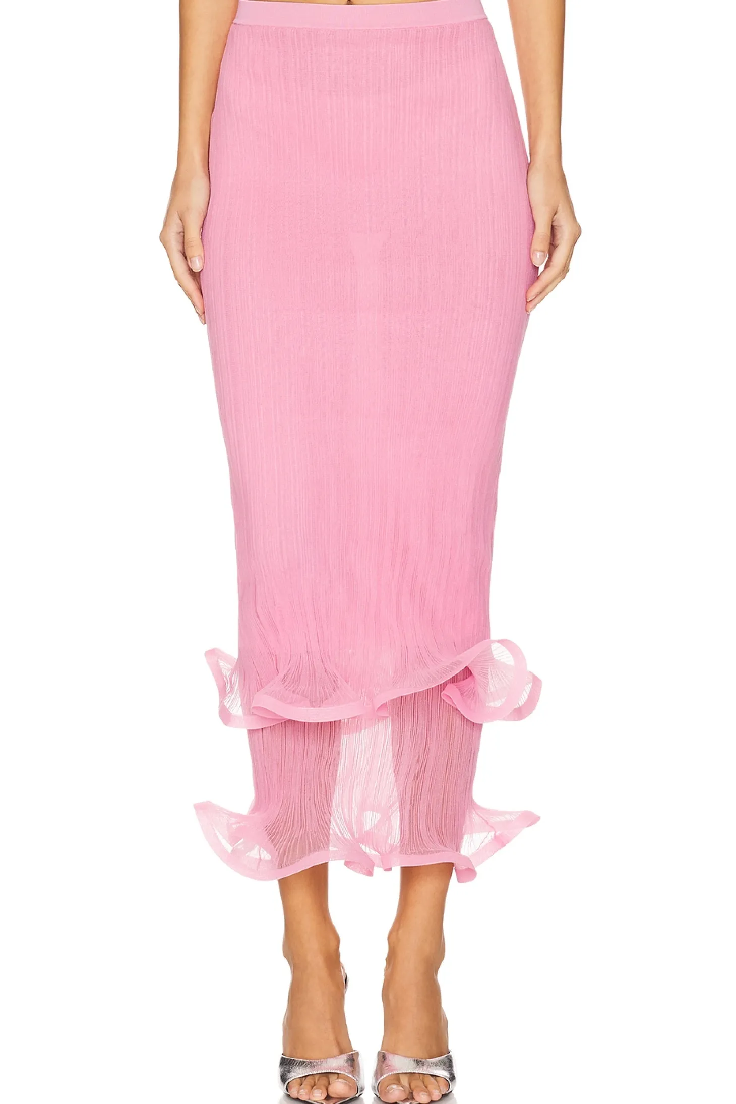 Self: 100% polyester Lining: 85% rayon 13% polyester 2% nylon.Made in China.Dry clean only.Fully lined.Pull-on styling with elastic waistband.Slinky gauze fabric.Item not sold as set Garment is made with a semi-sheer fabric, undergarments can show through.Skirt measures approx 37" in length