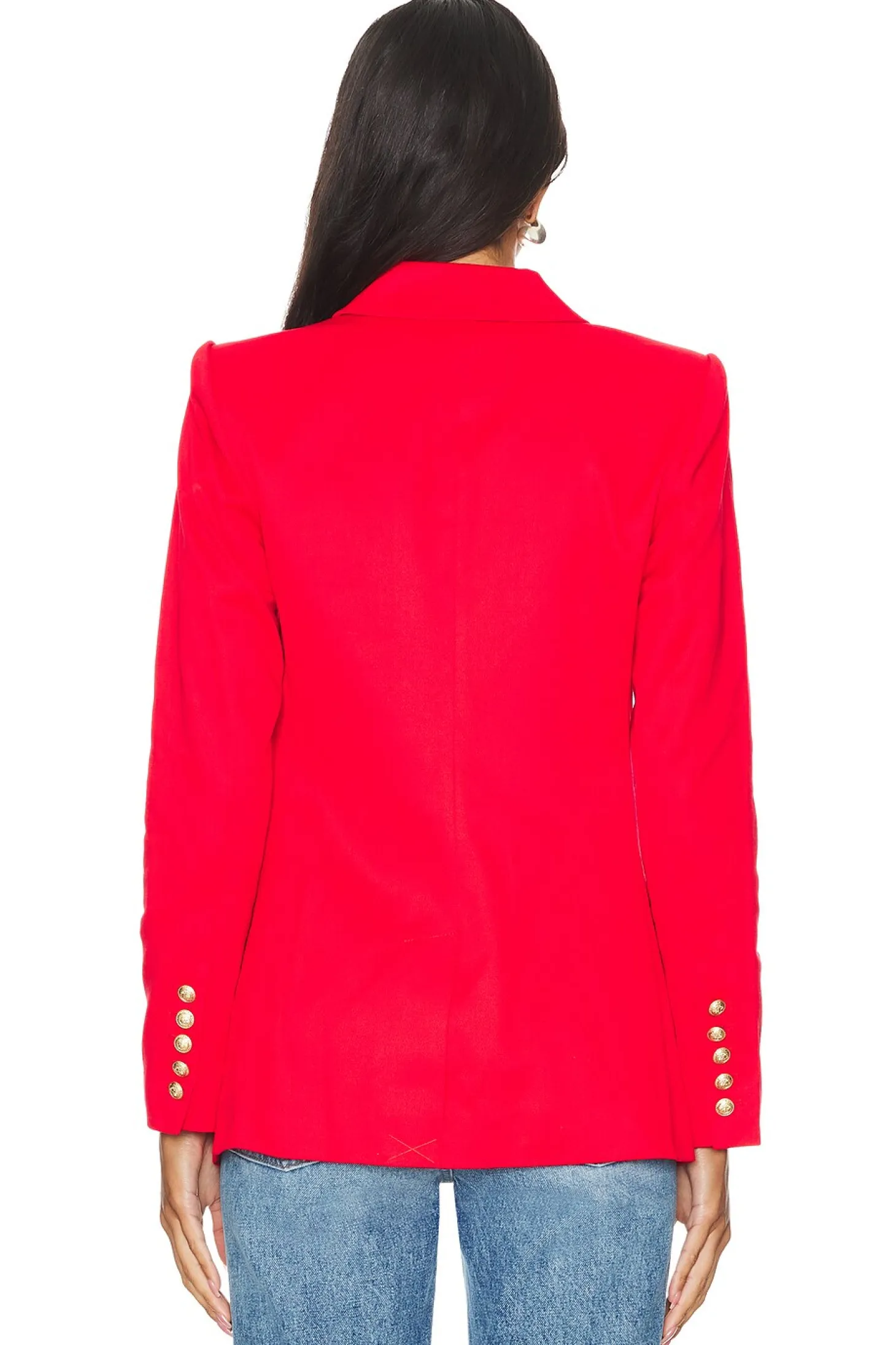 Self: 100% cotton Lining: 100% polyester.Made in China.Dry clean.Single-breasted with front button closure.Front flap pockets Buttoned cuffs.Buttoned cuffs Padded shoulders.Linen fabric with satin lining