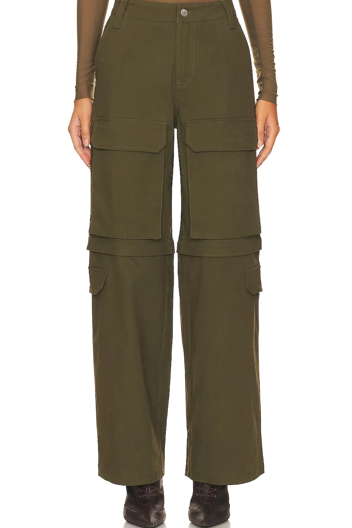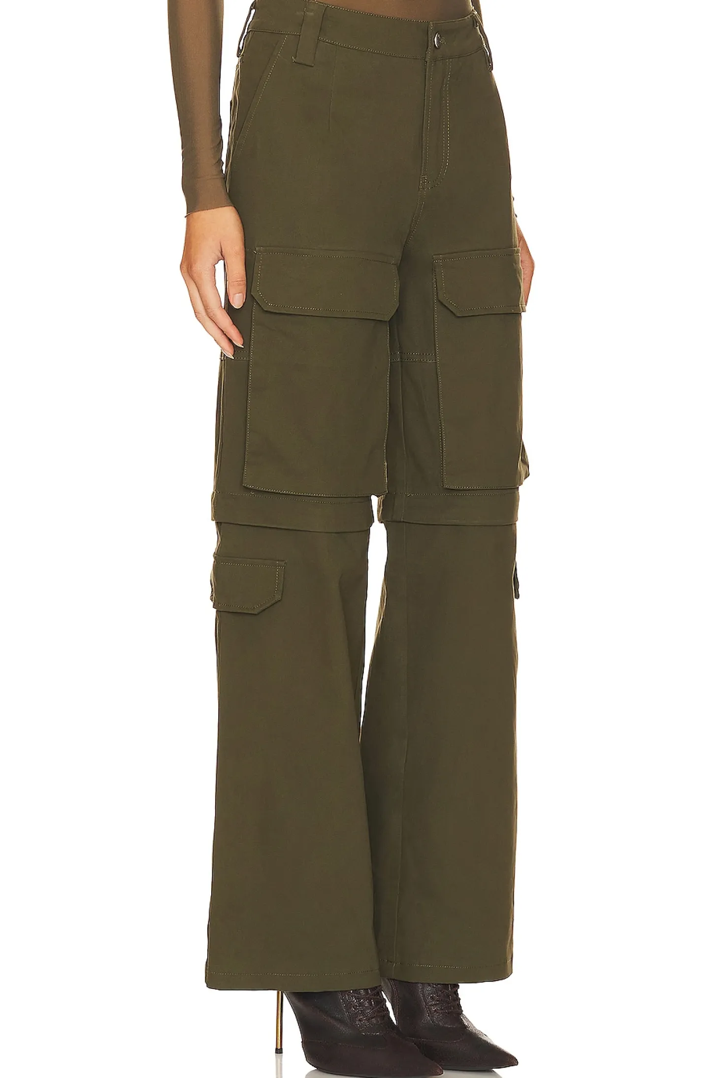 97% cotton 3% elastane.Made in China.Dry clean only.Zip fly with button closure.Cargo style pockets.Thick stretch twill fabric.20" at the knee and 20" at the leg opening