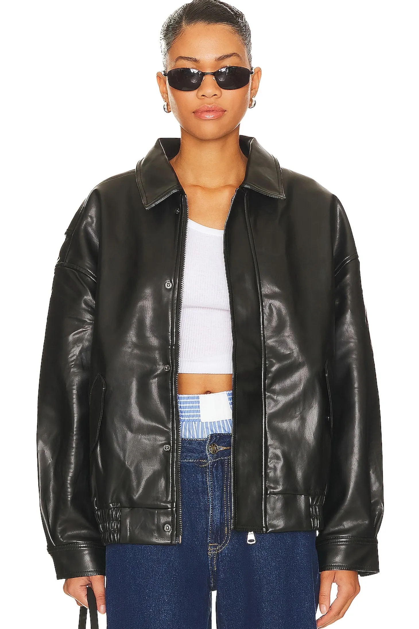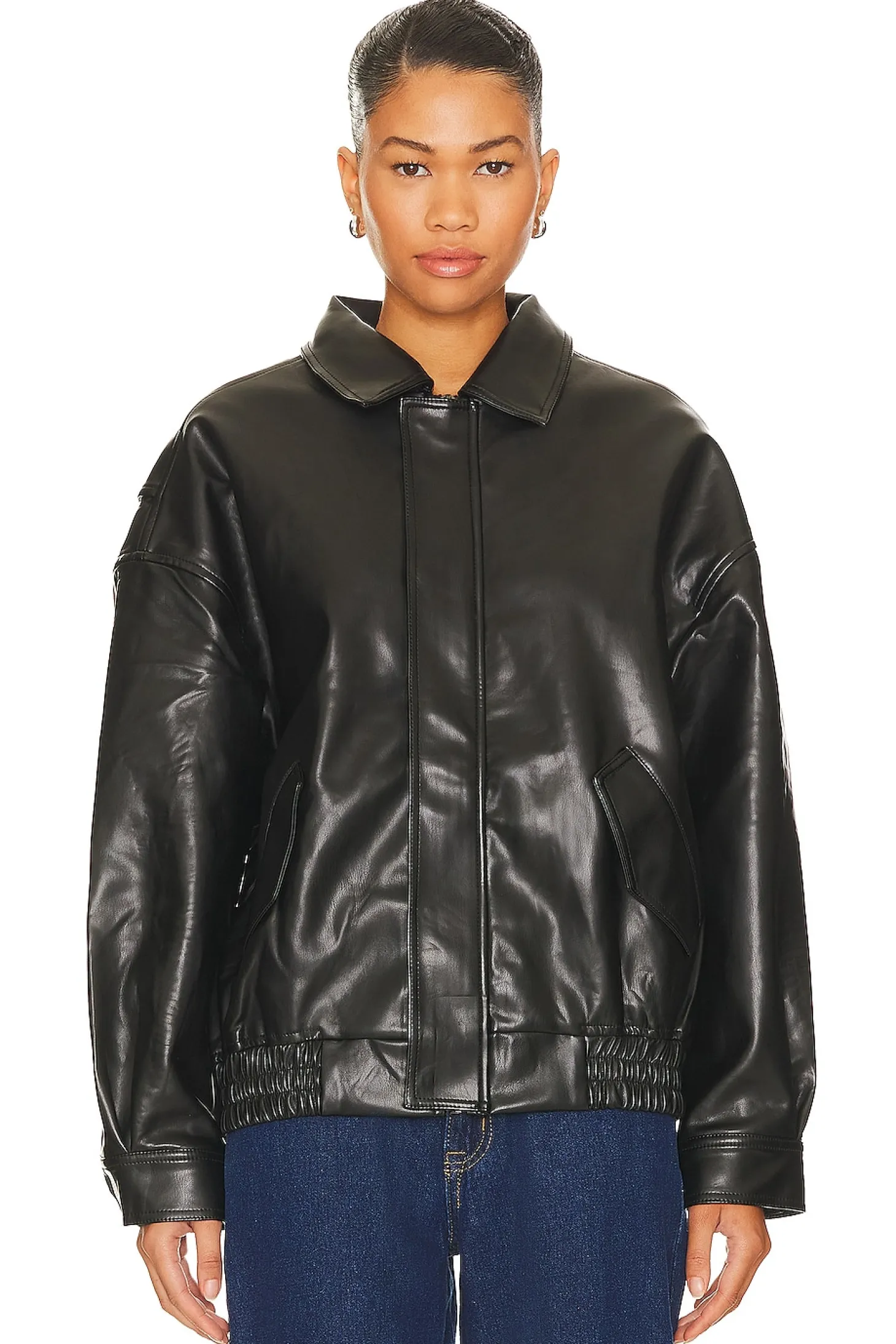 55% polyurethane 45% polyester.Made in China.Hand wash.Front zipper with snap button placket.Side flap pockets.Buttoned cuffs.Elastic hem.Soft faux leather fabric