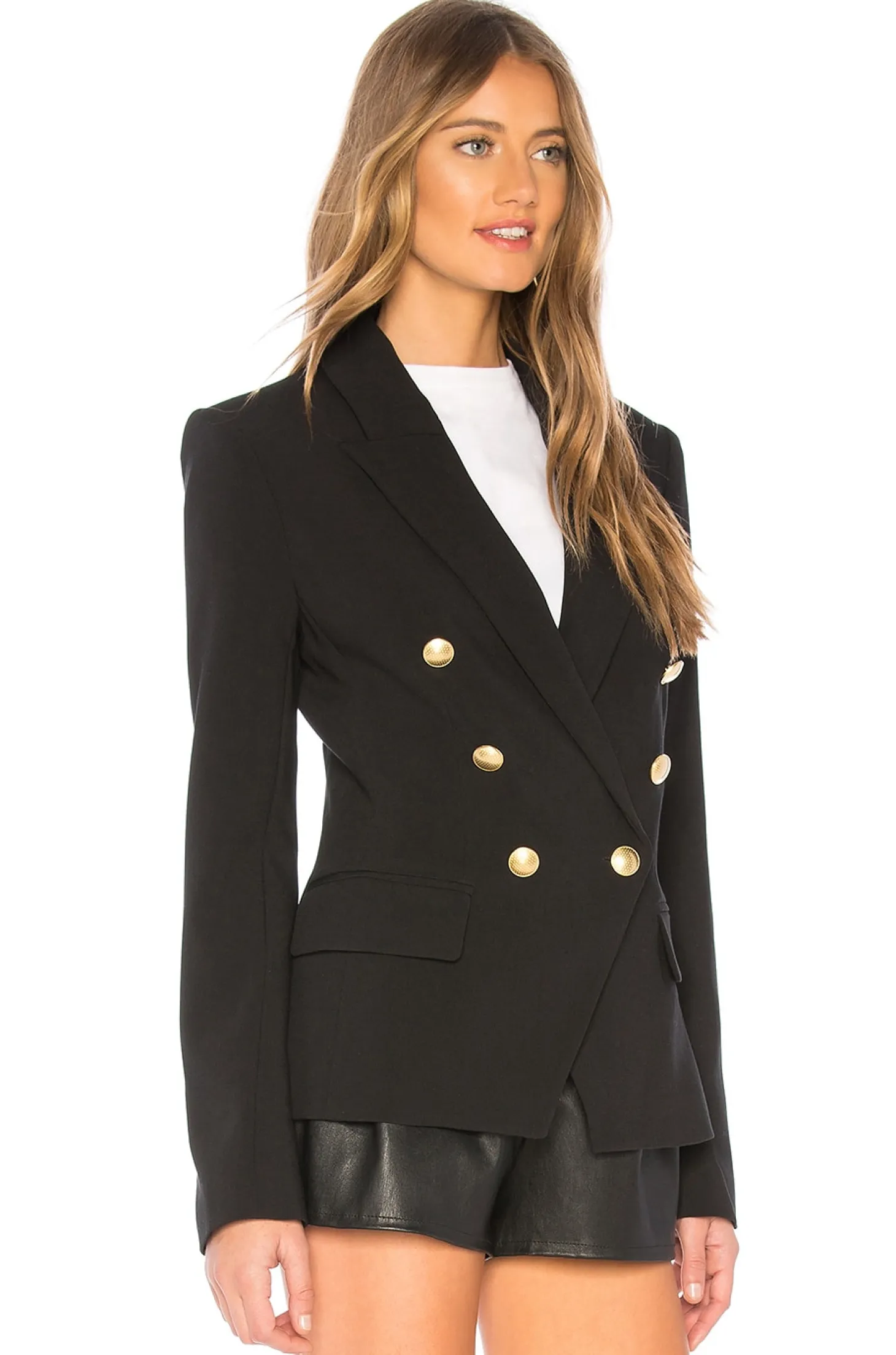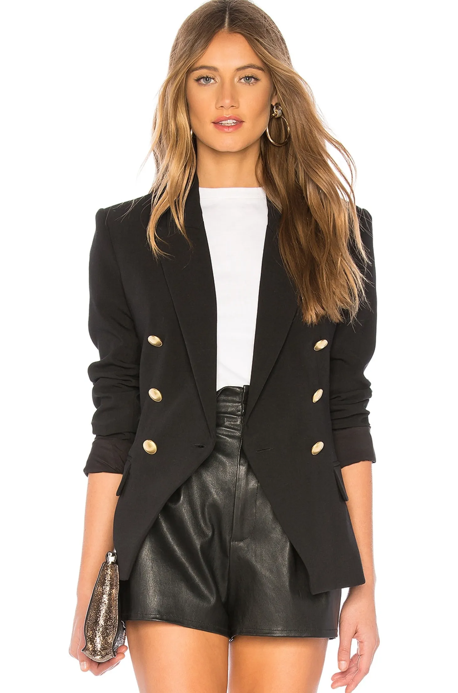 Self: 73% poly 20% viscose 7% elastane Lining: 100% poly.Dry clean only.Padded shoulders.Exposed front button closure with keyhole accents.Faux chest pocket.Faux front flap pockets.Button cuff sleeves.Imported