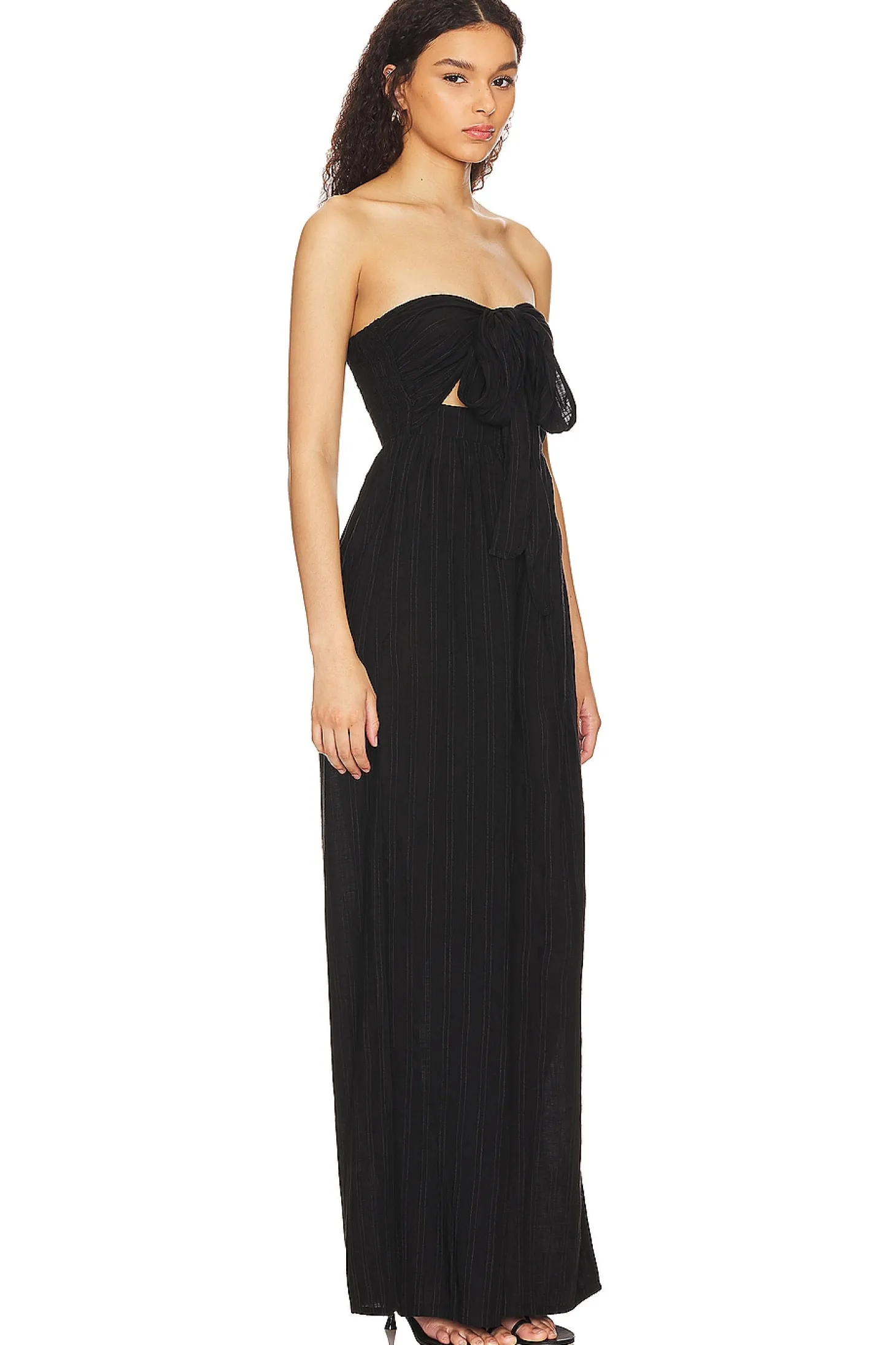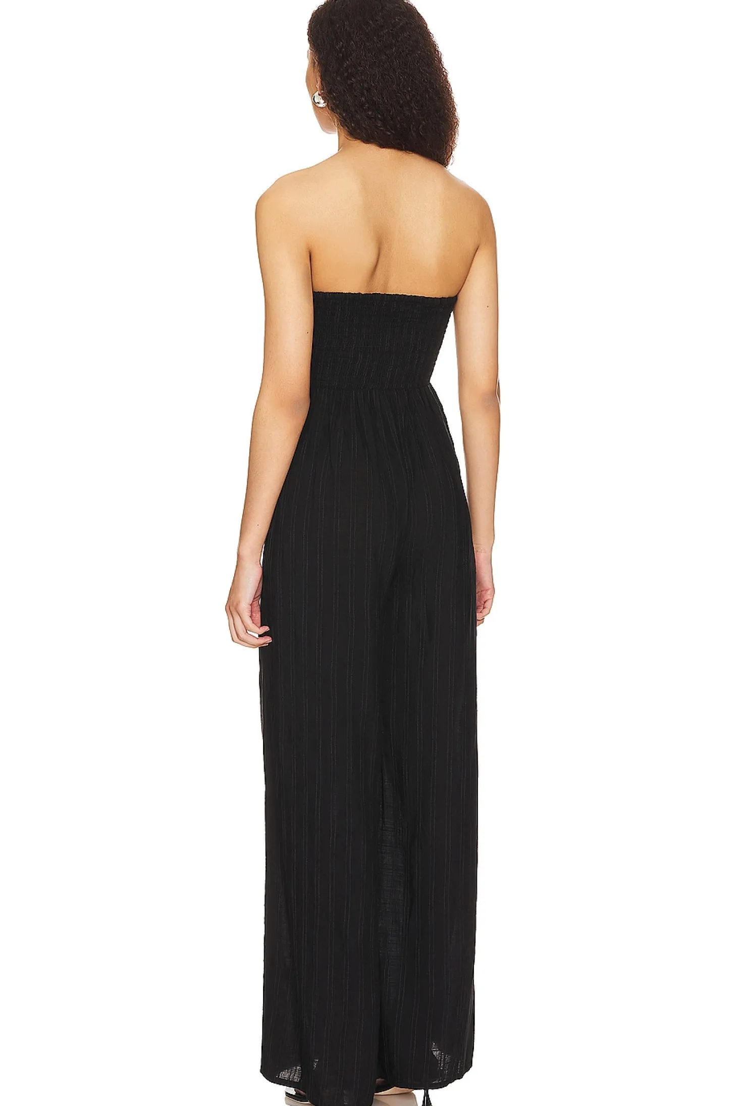 85% viscose 15% cotton.Made in India.Hand wash.Pull-on styling with front tie closure at bust.Smocked bodice and back.Pleated lightweight linen fabric.Neckline to hem measures approx 55" in length 24" at the knee and 24" at the leg opening