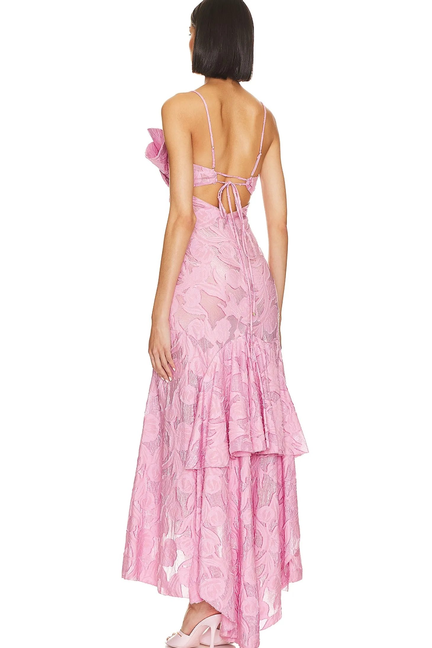 Shell: 92% nylon 8% spandex Lining: 100% silk.Made in Romania.Dry clean.Partially lined.Hidden back zipper closure with back tie and adjustable shoulder straps.Padded bust with ruffle embellishment.Jacquard fabric with draped high-low hem