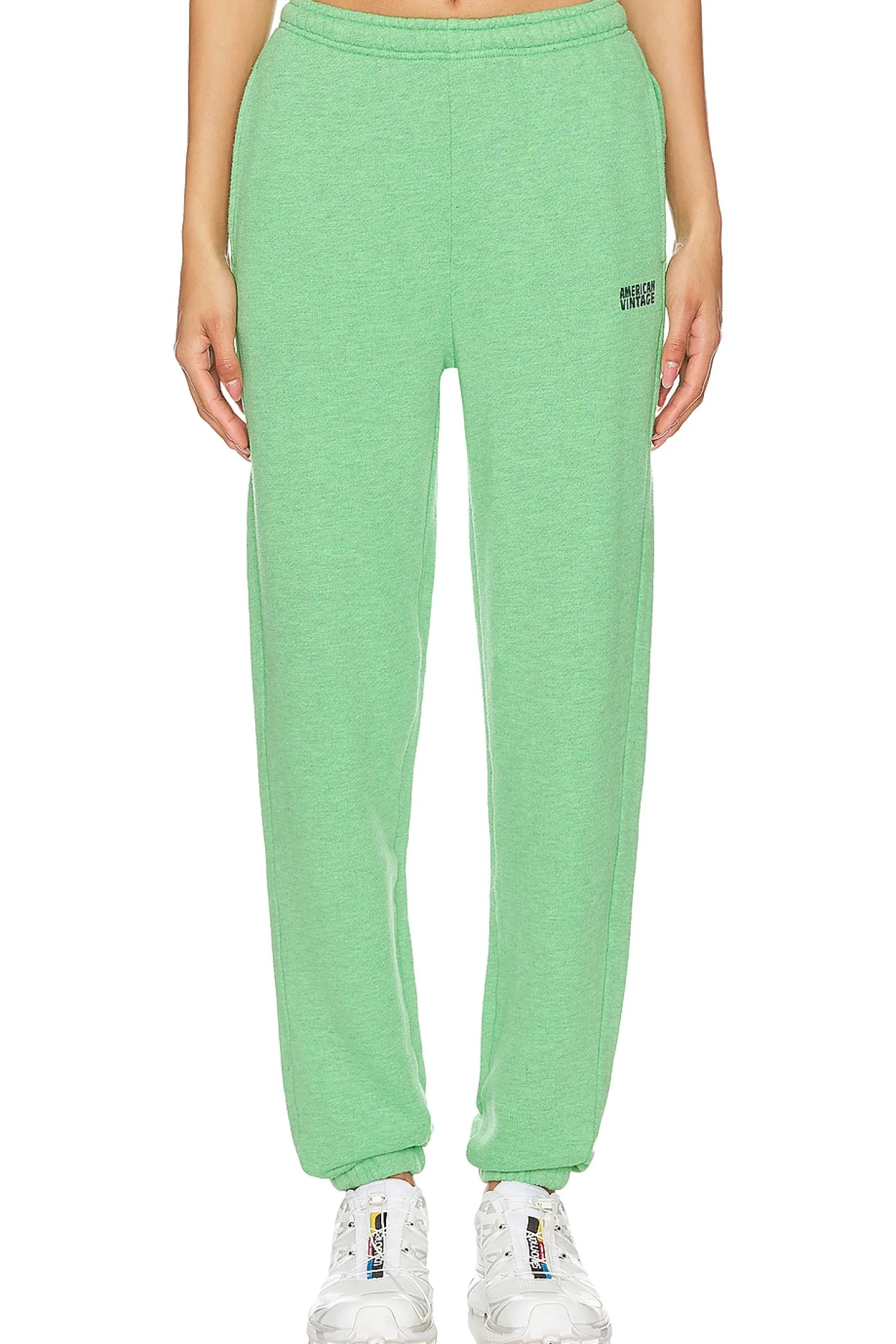 88% cotton 12% polyester.Made in Portugal.Machine wash.Pull-on styling with elastic waistband and interior drawstring tie closure.Side seam pockets.Screenprinted American Vintage logo at left leg.Fleece fabric with cinched cuffs Item not sold as a set.15" at the knee narrows to 9" at the leg opening