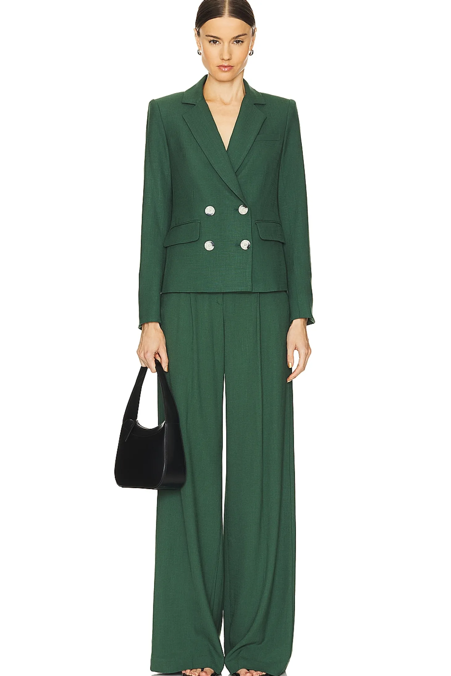 Self: 98% viscose 2% elastane Lining 1: 100% polyester Lining 2: 96% polyester 4% elastane.Made in USA.Dry clean only.Front button closure.Padded shoulders.Front flap pockets.Back vent.Lightweight suiting fabric Item not sold as a set