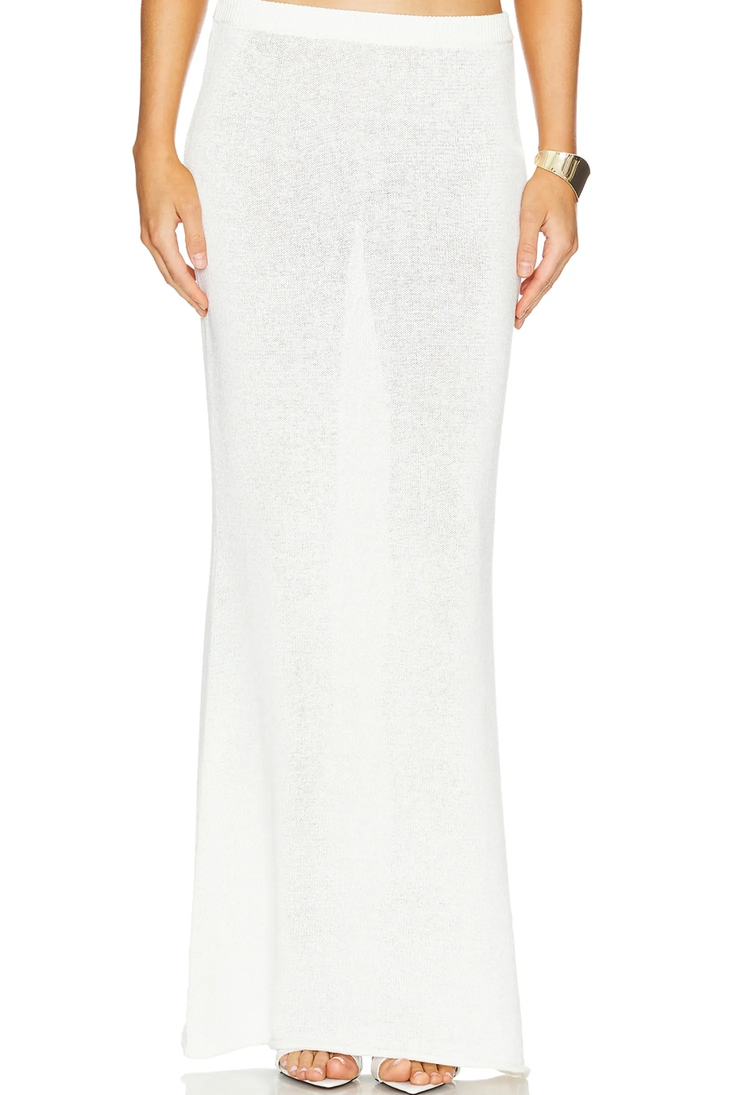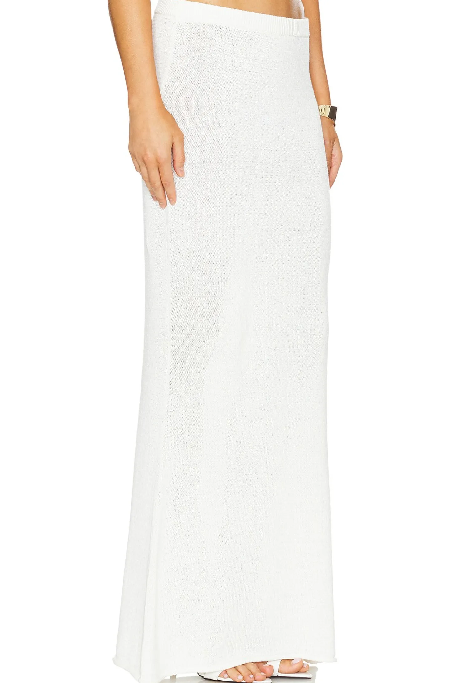 39% linen 31% cotton 30% nylon.Made in China.Dry clean.Unlined Garment is made with a semi-sheer fabric, undergarments can show through.Skirt measures approx 45" in length