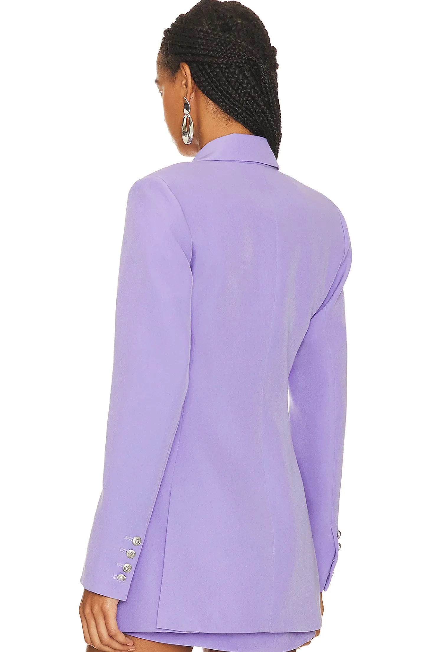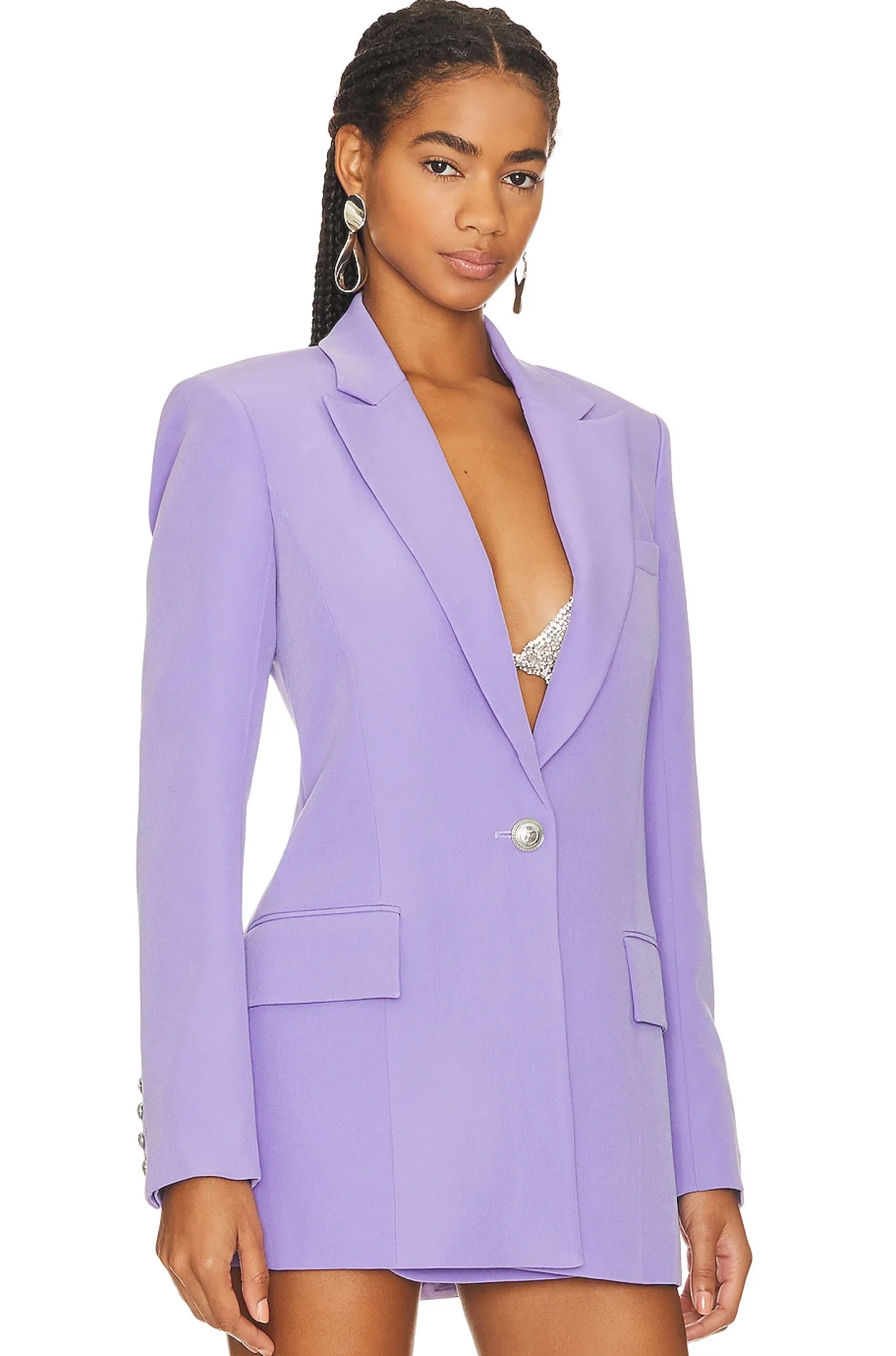 Self: 93% polyester 7% spandex Lining: 95% polyester 5% spandex.Made in China.Dry clean only.Singular front button closure.Padded shoulders.Buttoned cuffs.Suiting fabric.Item not sold as a set
