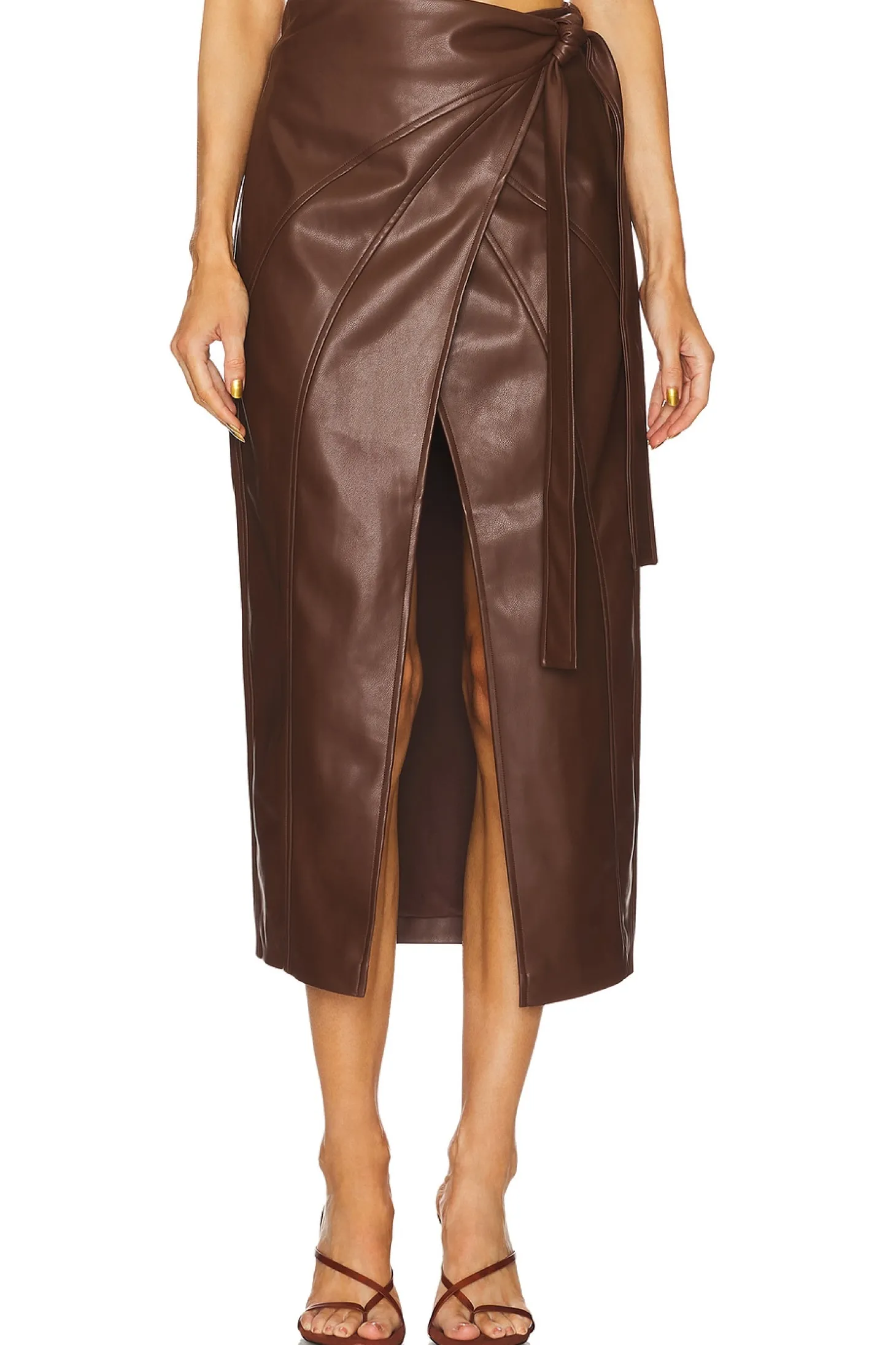 Self: 100% polyurethane Backing: 100% polyester Lining: 95% polyester 5% elastane.Made in China.Dry clean.Unlined.Wrap style with button and tie closure.Faux leather.Skirt measures approx 33" in length