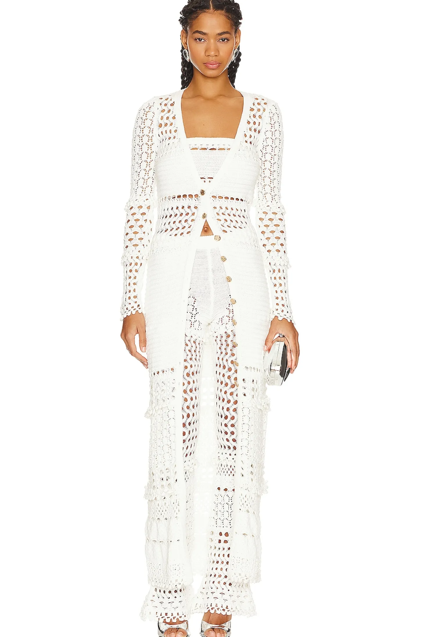 85% cotton 10% polyester 5% metallic.Made in China.Hand wash.Pull-on styling with elastic waistband.Closed knit at panty.Open crochet knit fabric with metallic threading.Item not sold as set.12" at the knee breaks to 22" at the leg opening.The Kyla Pant will instantly elevate your vacay wardrobe. Whether you're on the sand or on a sunset stroll, these pants offer versatility and style.