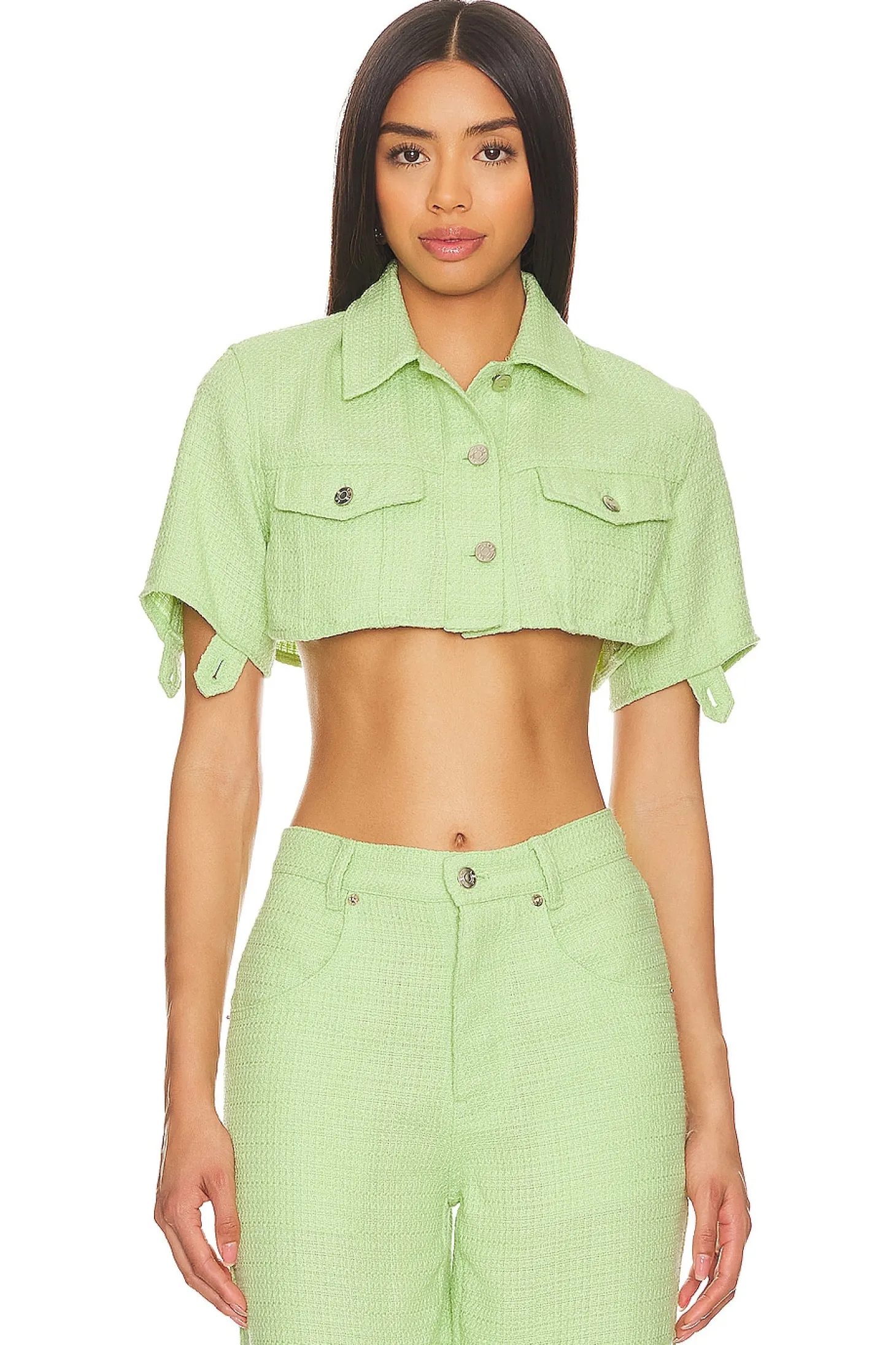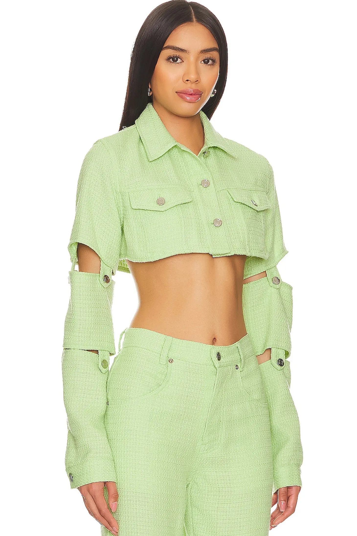 Cotton blend.Imported.Machine wash recommended.Front button closure.Dual flap pockets at breast with button closure.Statement detachable sleeves with cut-outs.Item not sold as a set
