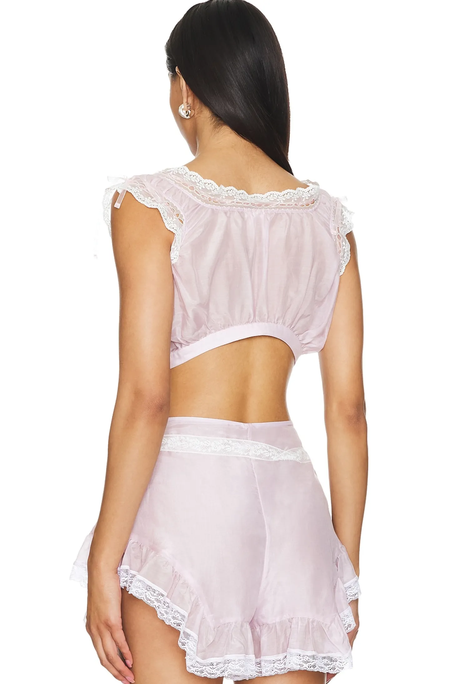 30% silk 70% cotton.Made in China.Dry clean.Garment is intentionally sheer, undergarments will show through. Please note undergarment not included.Front tie closure.Item not sold as a set