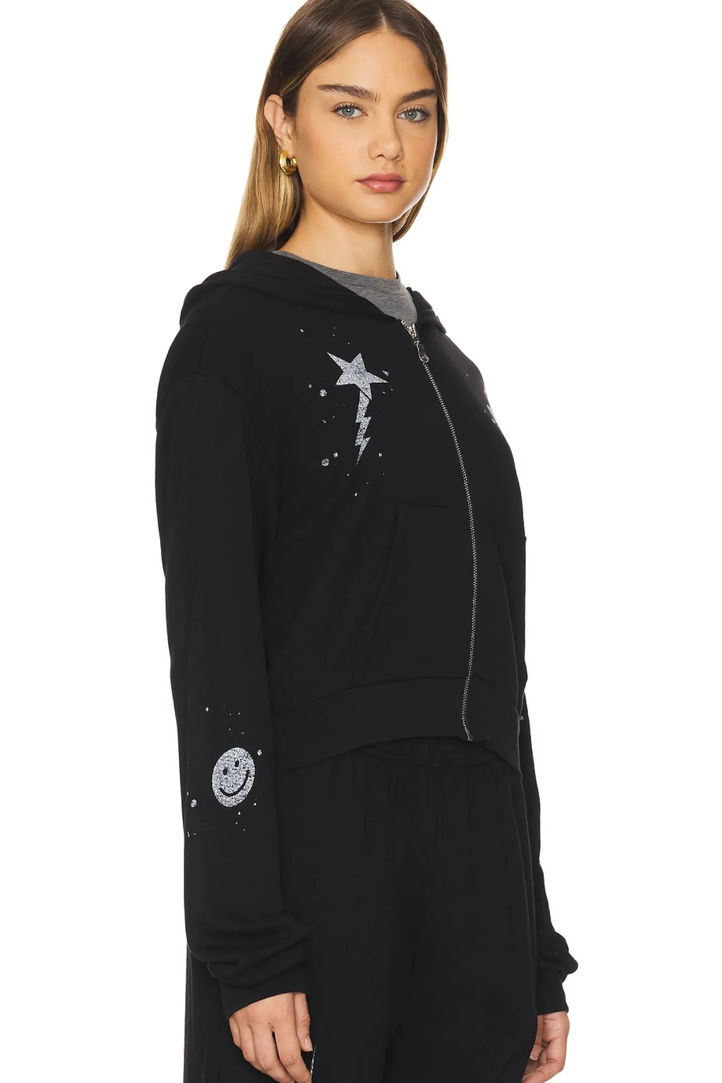 100% cotton.Made in USA.Machine wash.Exposed front zipper closure.Hoodie design.Graphic detail at front and back.Front pockets Jersey fabric Item not sold as a set