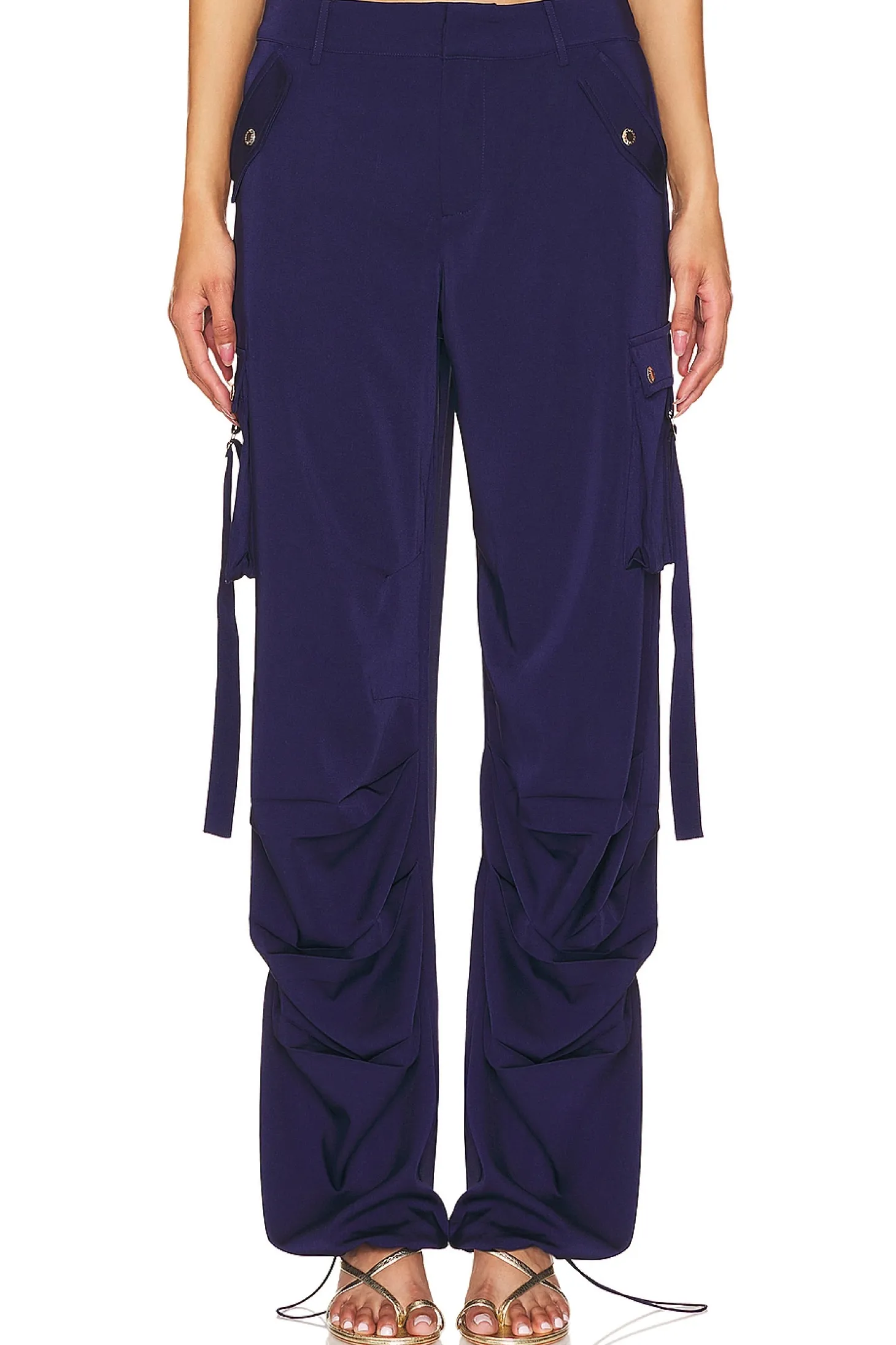 100% polyester.Made in China.Hand wash.Zip fly with hook and bar closure.Strappy detail.6-pocket styling includes two cargo button pockets.Satin fabric with drawcord hem Item not sold as set.20" at the knee narrows to 14" at the leg opening