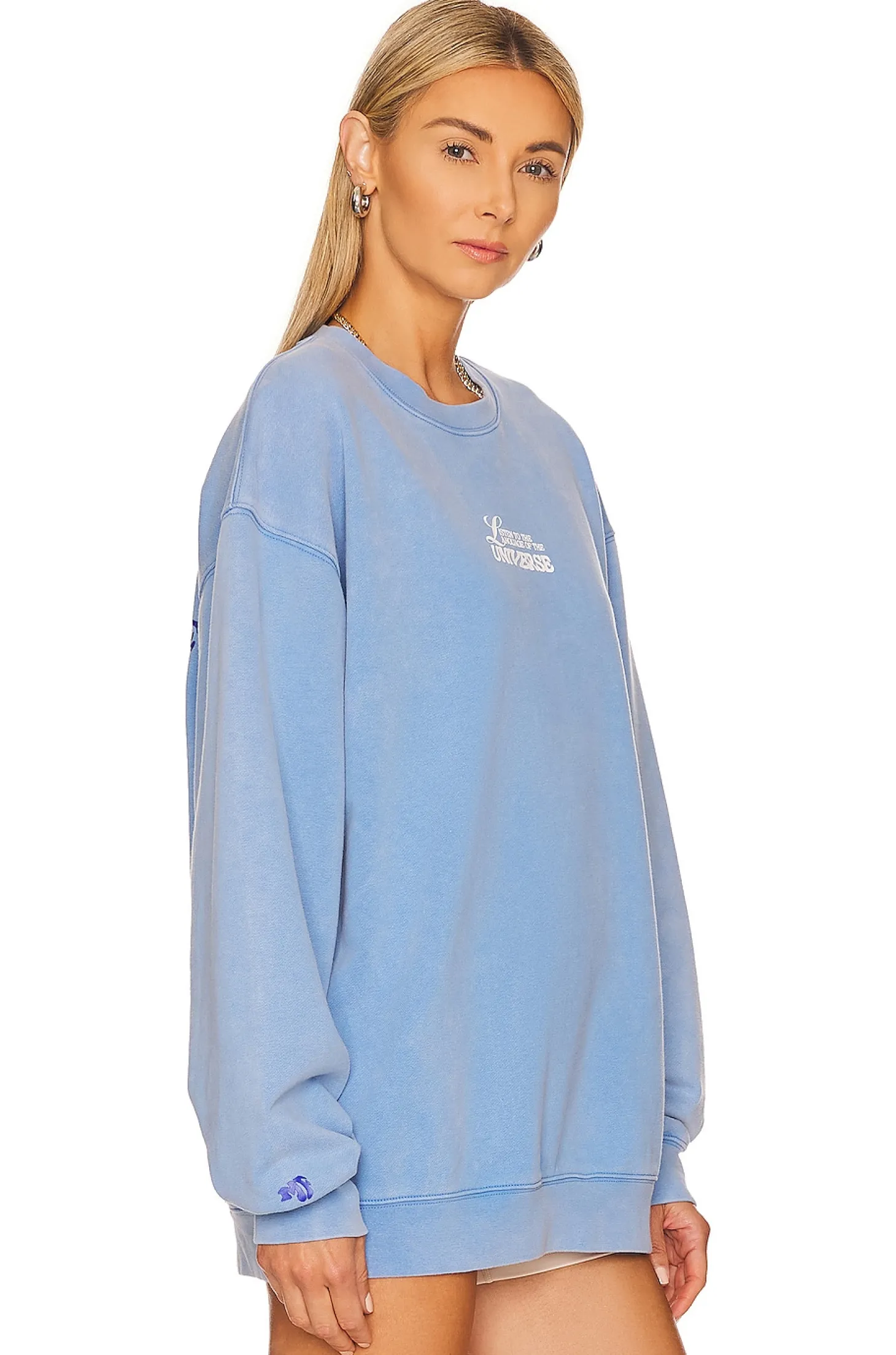 "Listen To The Language Of The Universe".100% cotton.Made in USA.Machine wash.Ribbed neckline, cuffs and hem.Terrycloth lining.Introducing The Mayfair Group Language of the Universe Crewneck. Elevate your style with a touch of cosmic inspiration.
