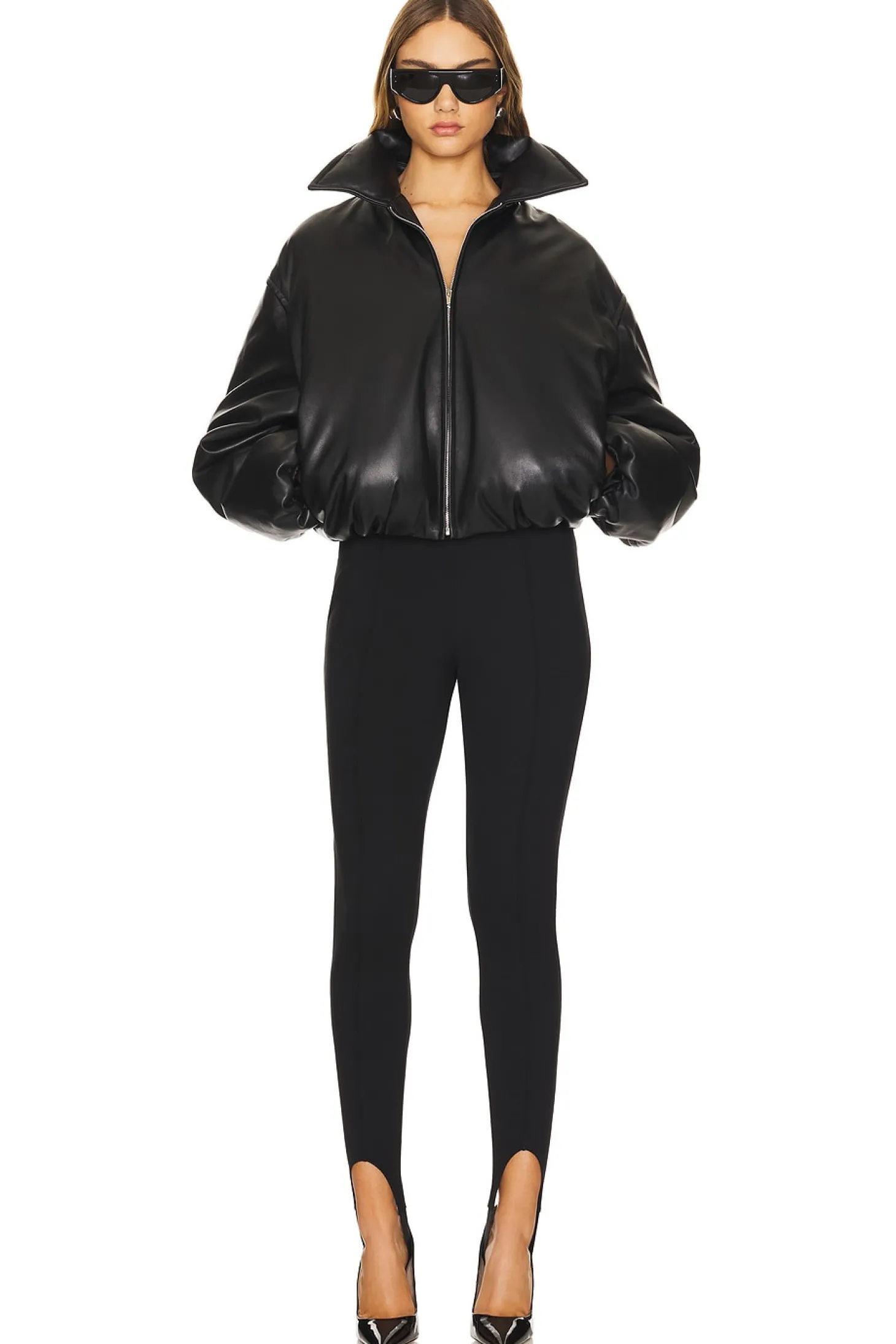 Self: 100% lambskin leather Lining: 100% viscose.Made in China.Dry clean only.Front zipper closure.Side seam pockets.Drop shoulder and elastic cuff.Padded design