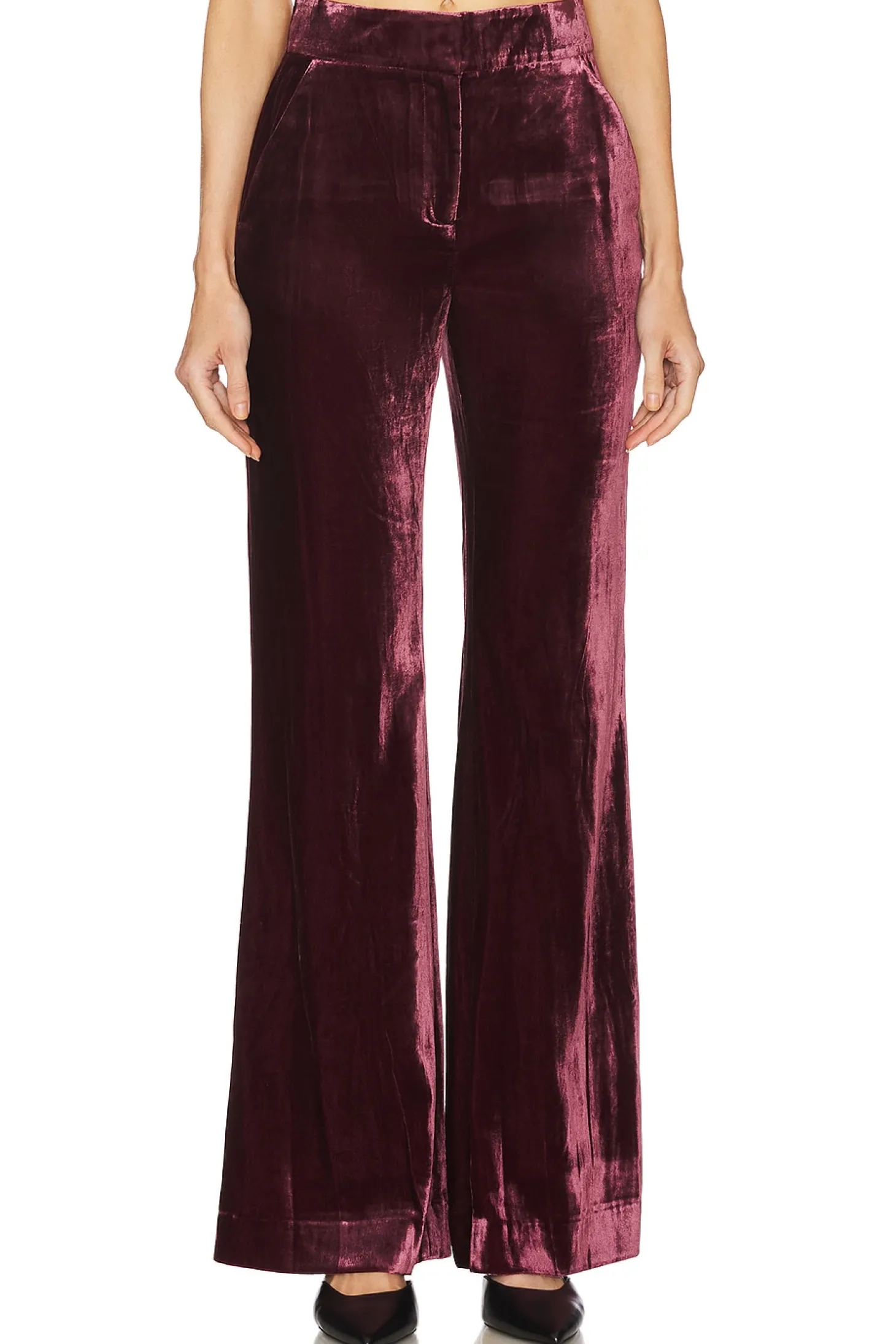 Self: 75% rayon 25% nylon Lining: 100% polyester.Made in China.Dry clean only.Zip fly with hook and bar closure.4-pocket design.Velvet fabric.Item not sold as set.17" at the knee breaks to 23" at the leg opening