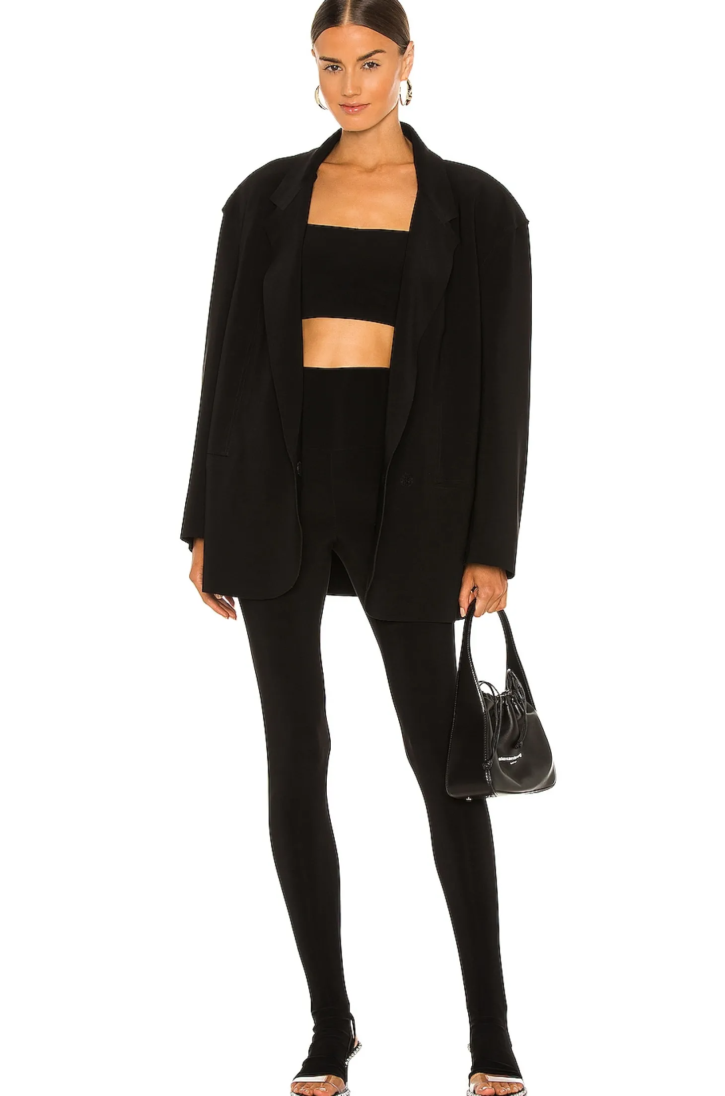 95% poly 5% spandex.Hand wash cold.Stretch fit.Stirrup leg detail.Slinky fabric.Item not sold as a set.Imported.style runs large, size down