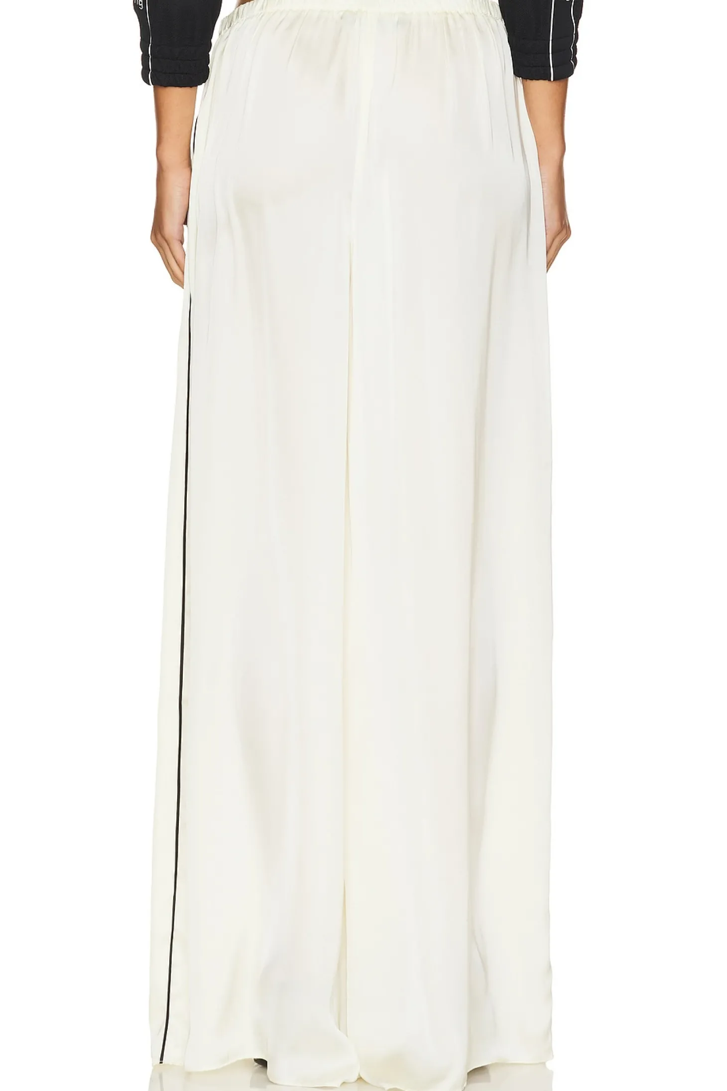 100% polyester.Made in China.Hand wash.Pull-on styling with elastic waistband.Side pockets.Satin fabric.28" at the knee breaks to 30" at the leg opening
