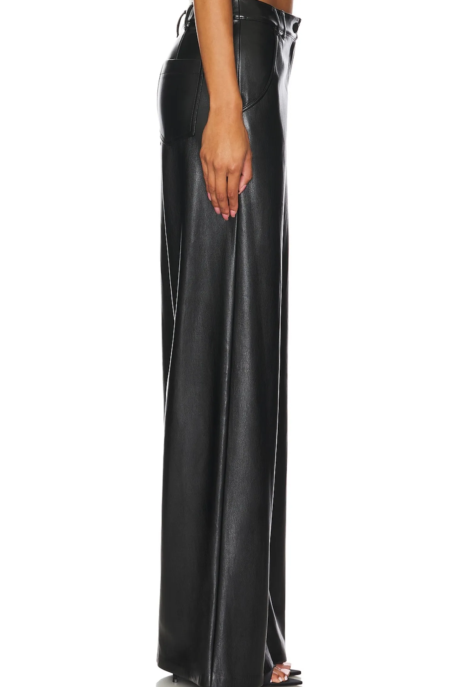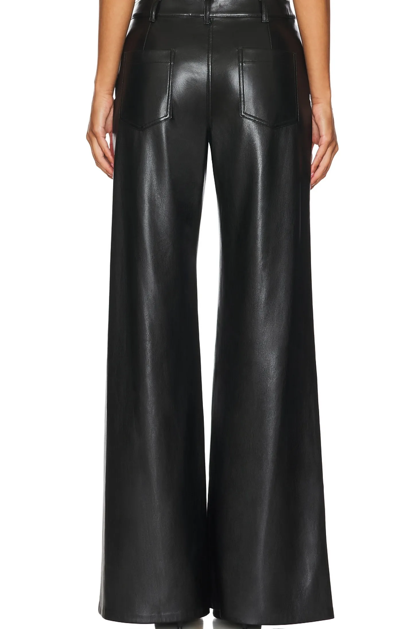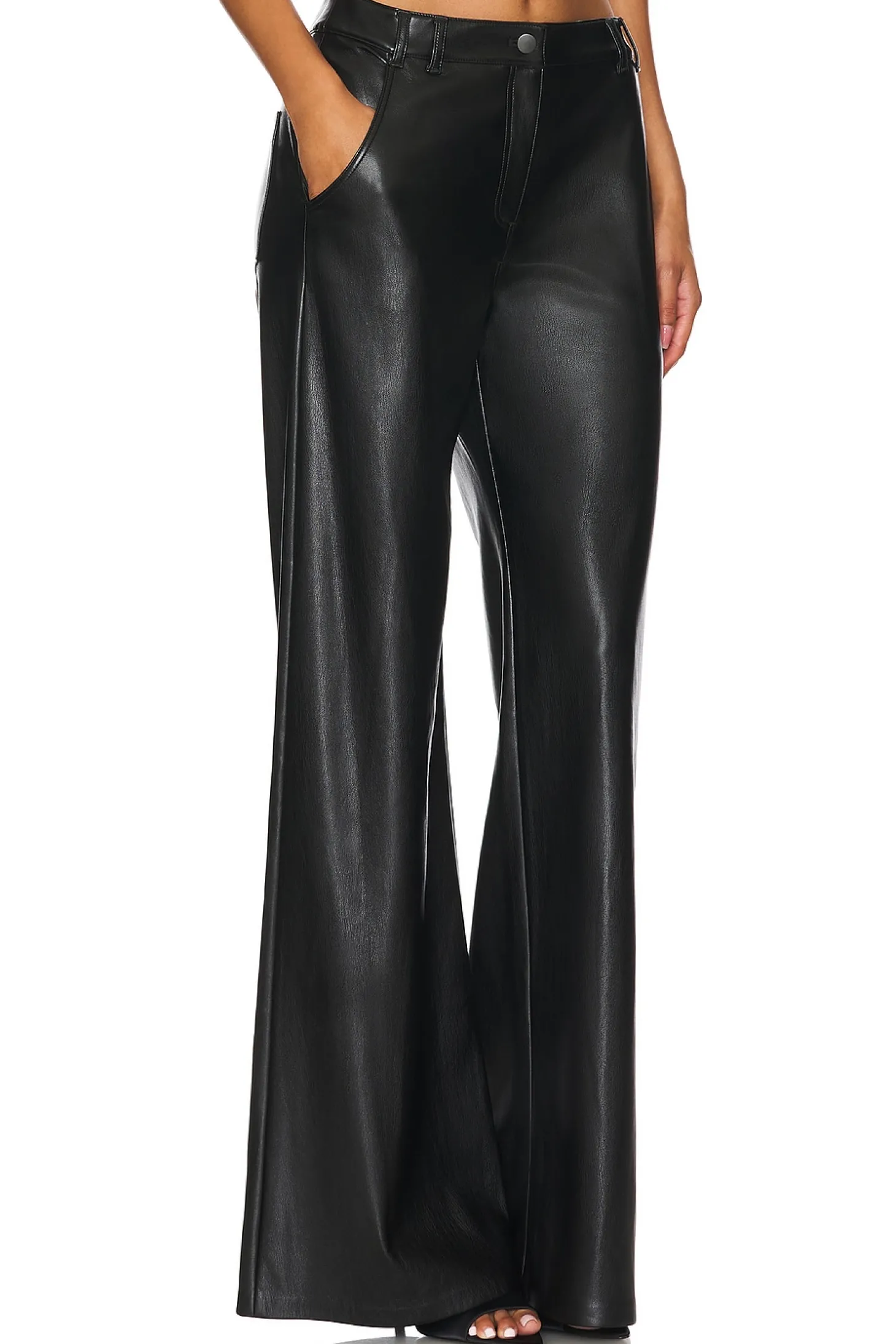 Faux leather textile.Imported.Spot clean recommended.Zip fly and button closure.4-pocket design.Faux leather.Item not sold as set.21" at the knee breaks to 26" at the leg opening