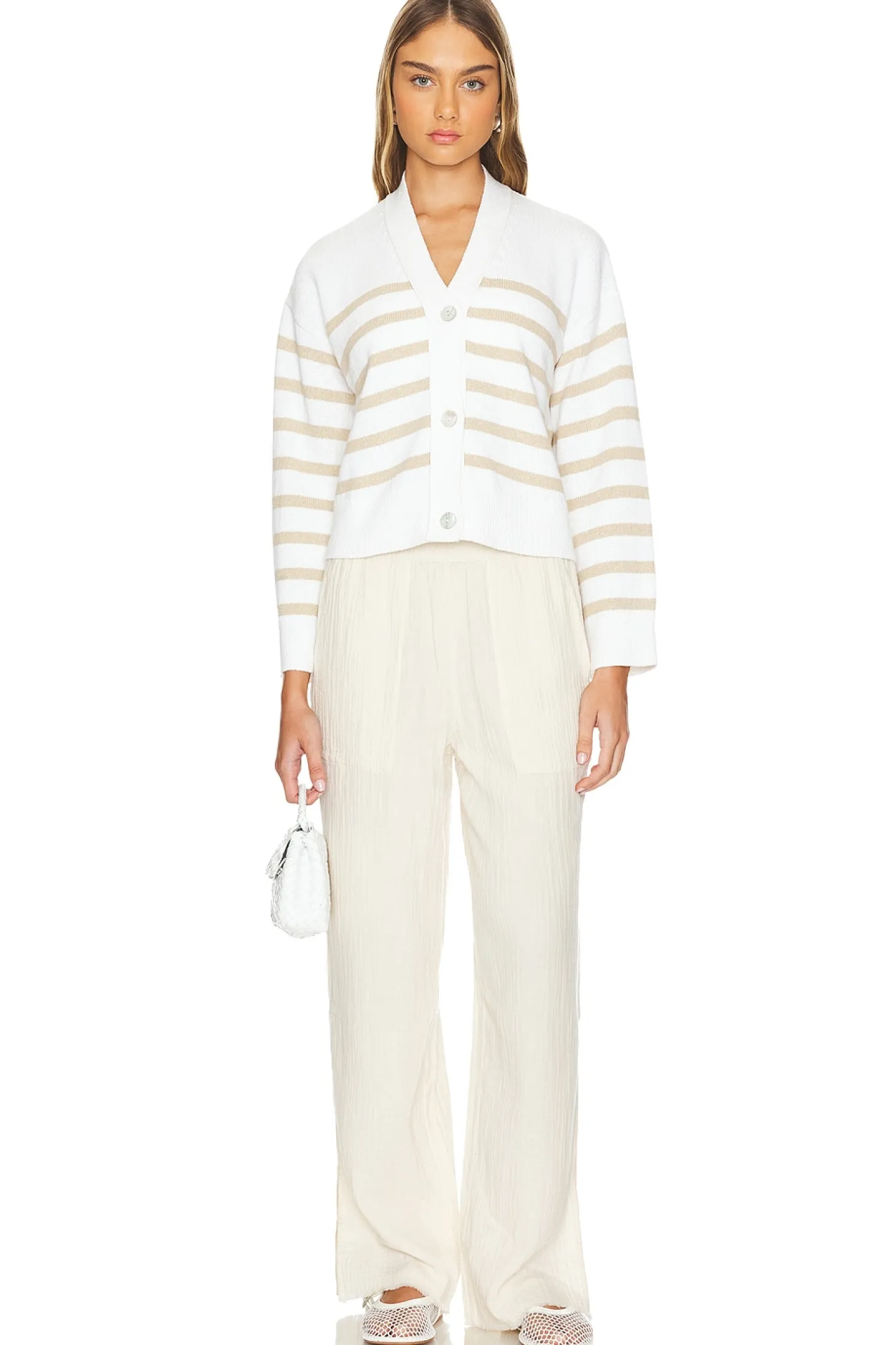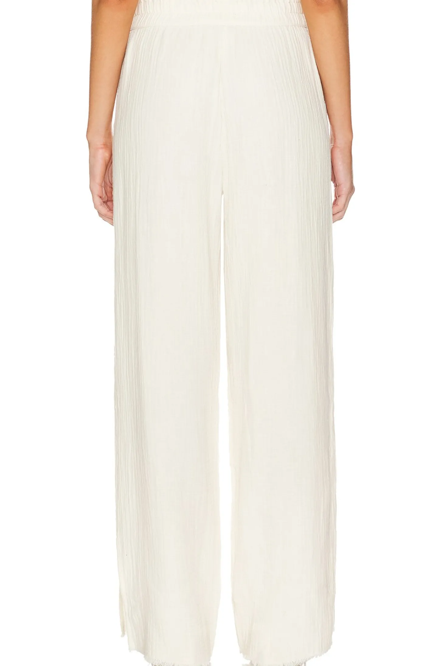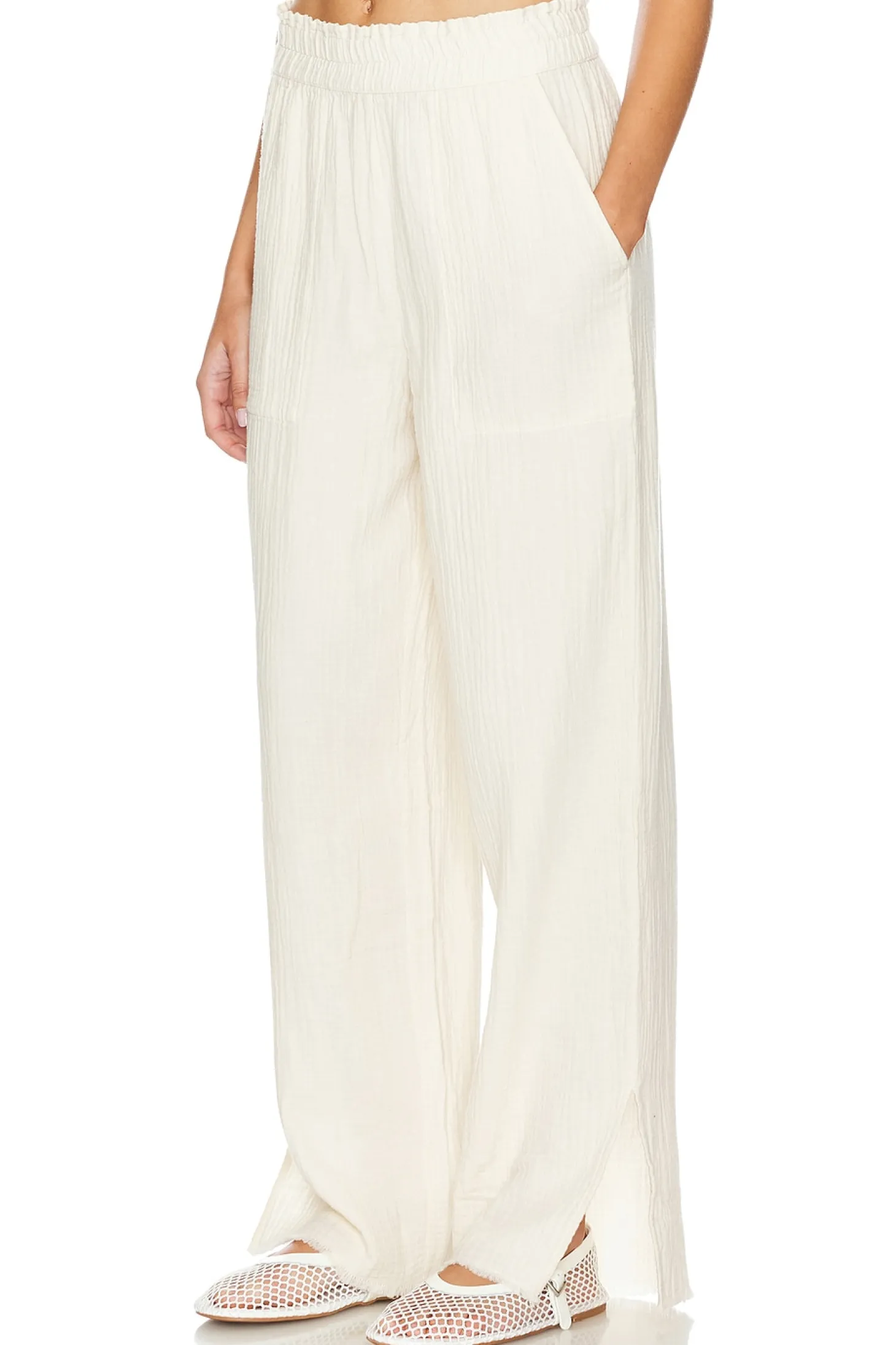 100% organic cotton.Made in China.Hand wash.Elastic waistband.Side pockets.Item not sold as set.Gauze fabric with frayed hem detail.25" at the knee narrows to 19" at the leg opening